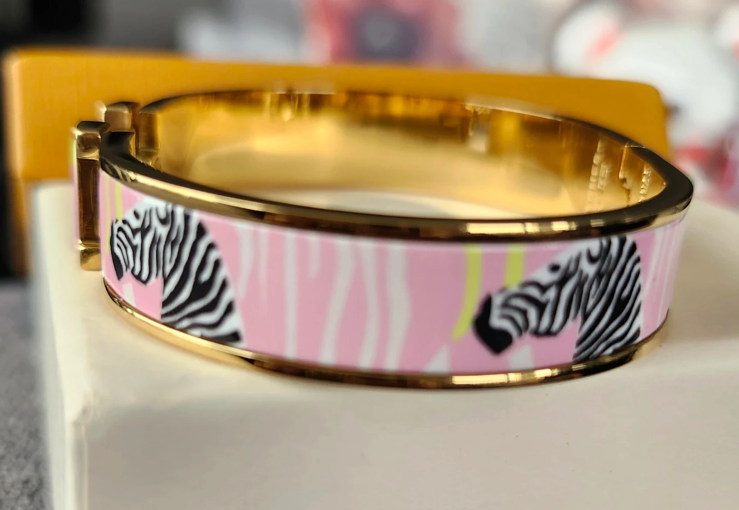 This is a bangle bracelet. It features a fun pink background with white stripes and zebra heads. The bracelet is gold-toned with a smooth finish.