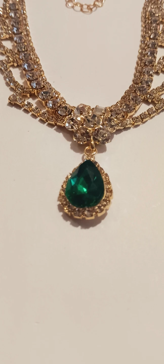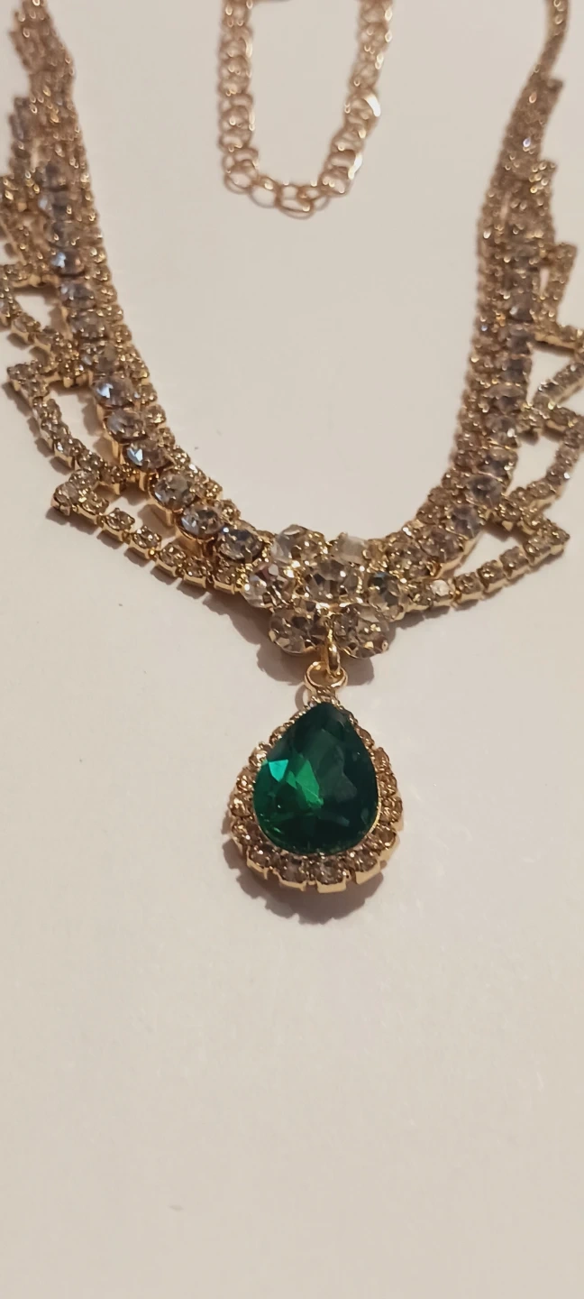 New !! This gold-tone choker necklace features a striking emerald green teardrop pendant. Clear rhinestones accent the multi-layered chain design. It's a statement piece for any occasion! 16" . New. ALL MY PRICES ARE NEGOTIABLE !!