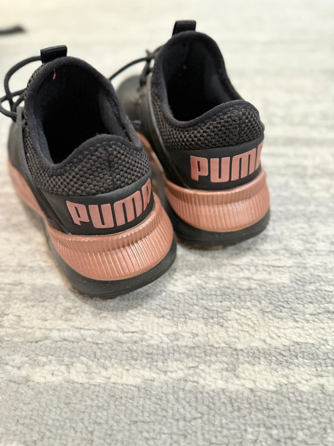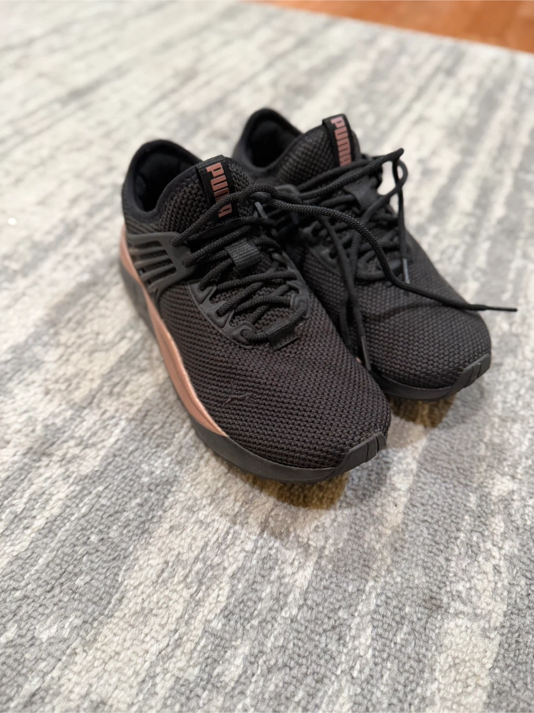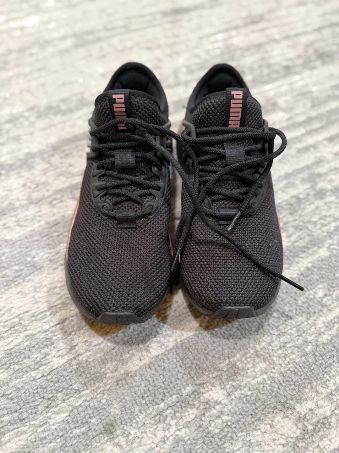These are Puma women's running shoes. They feature a black knit upper with rose gold accents on the heel and sole. Lace-up closure for a secure fit. Mesh material for breathability. Worn 2-3 times at the gym only. It’s a little bit tight for my feet that’s why selling it.