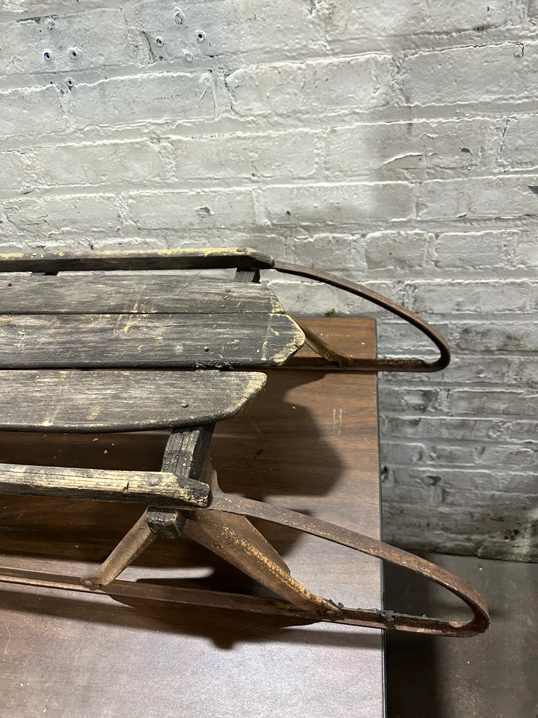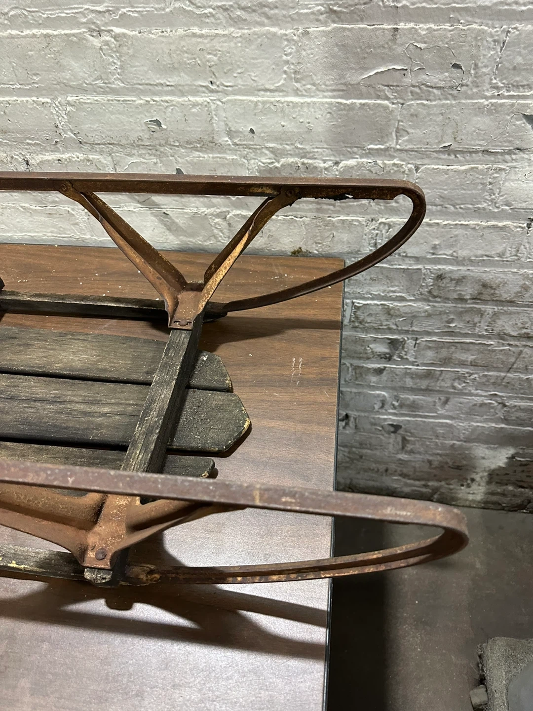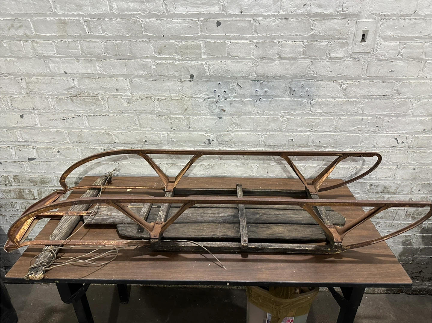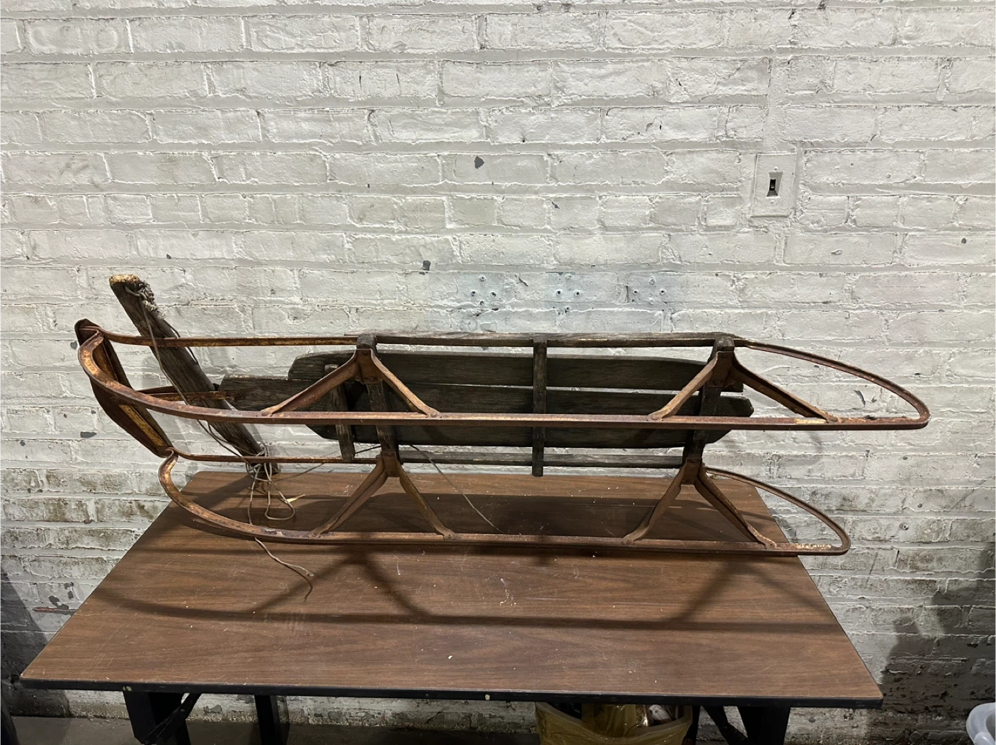 This is a vintage sled frame made of metal and wood. It's a classic design with metal runners and wooden slats. It's a great piece for a winter display or restoration project!