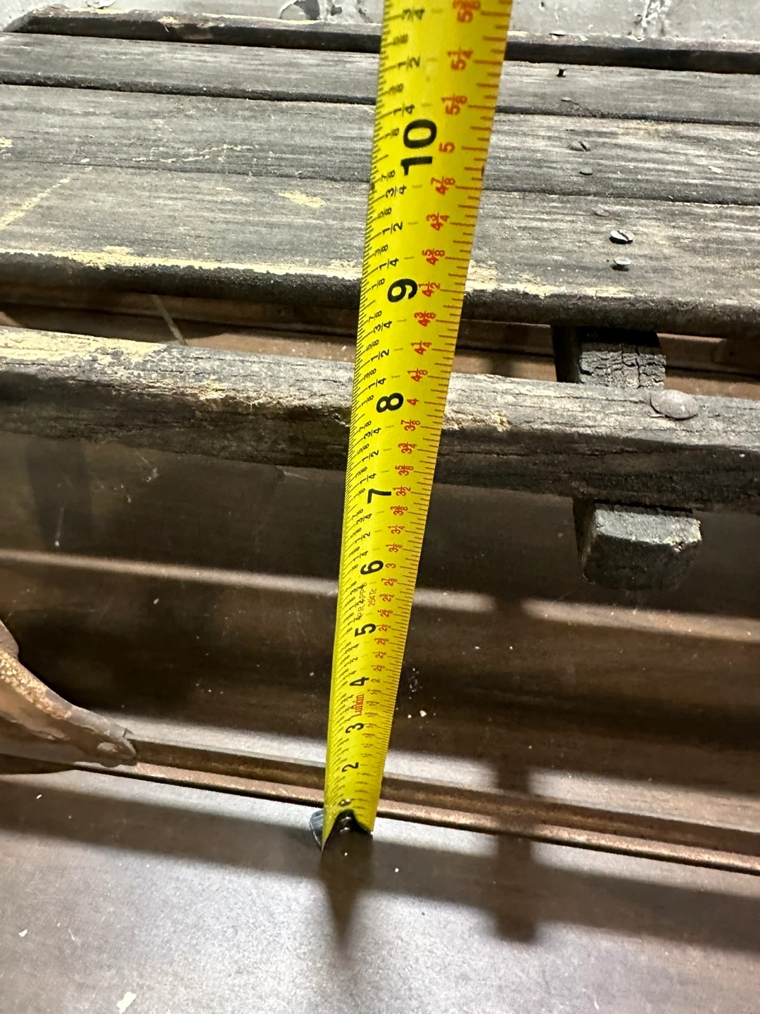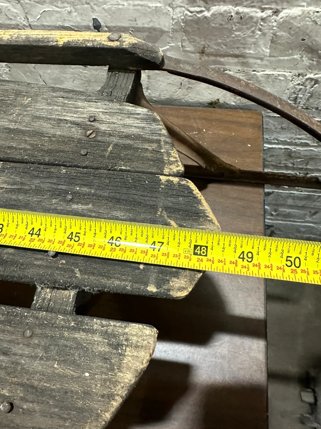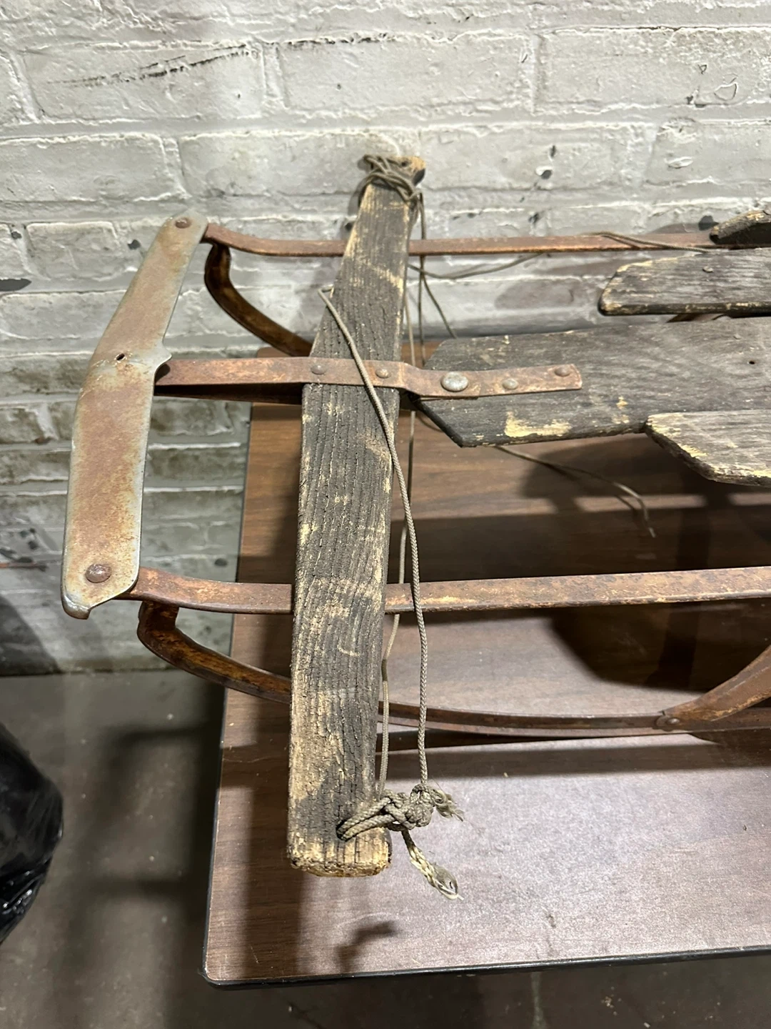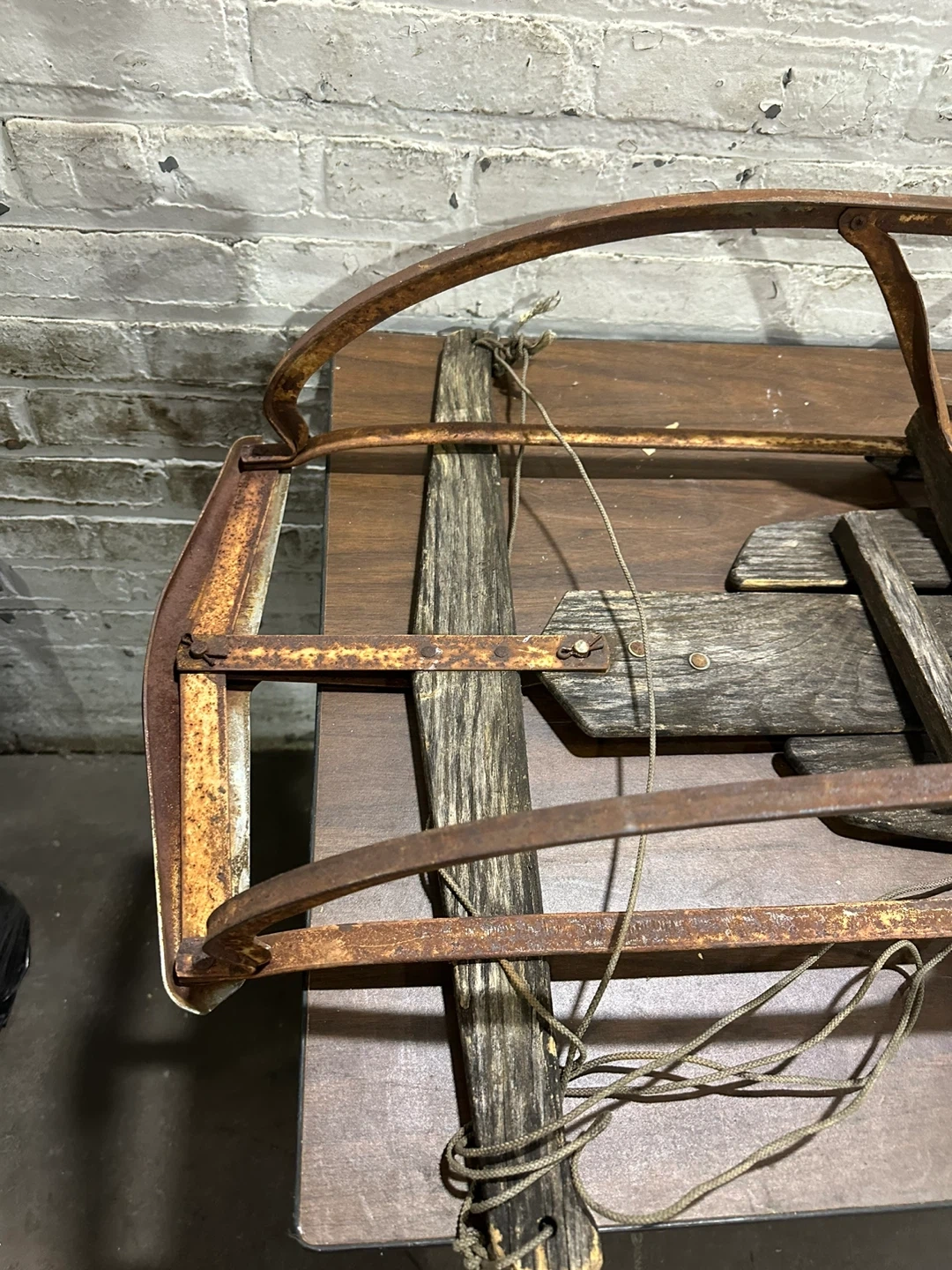 This is a vintage sled frame made of metal and wood. It's a classic design with metal runners and wooden slats. It's a great piece for a winter display or restoration project!