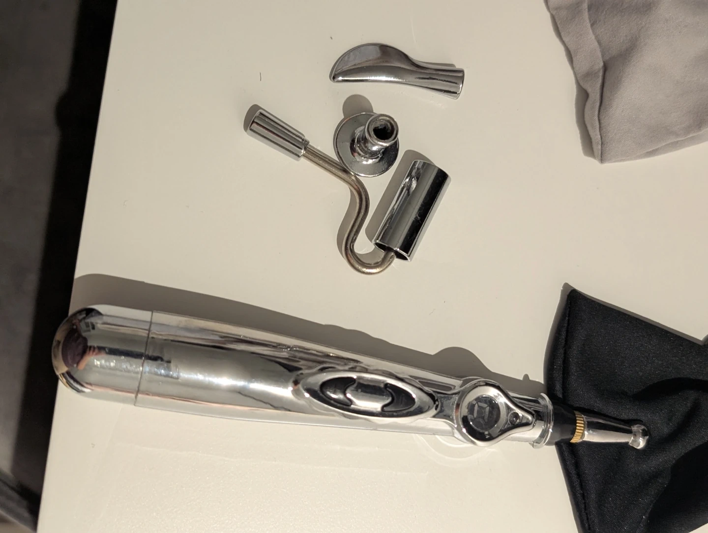 This is an electronic acupuncture pen with multiple massage heads included. It's made of metal and designed for therapeutic use. It's a useful tool for targeted pain relief.