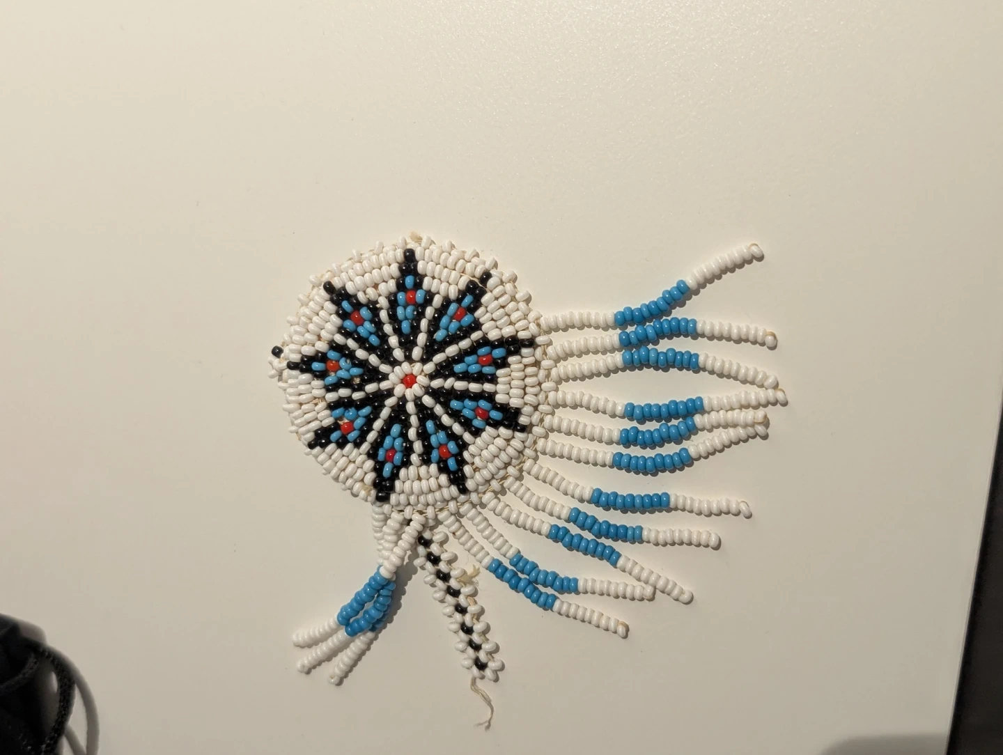 This is a handmade beaded pin or brooch. It features a colourful starburst design with white, blue, black, and red beads. Tassels with blue and white beads hang from the side. It's a lovely decorative accessory.