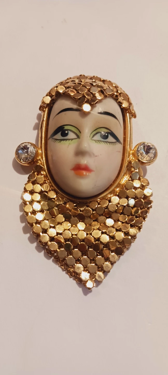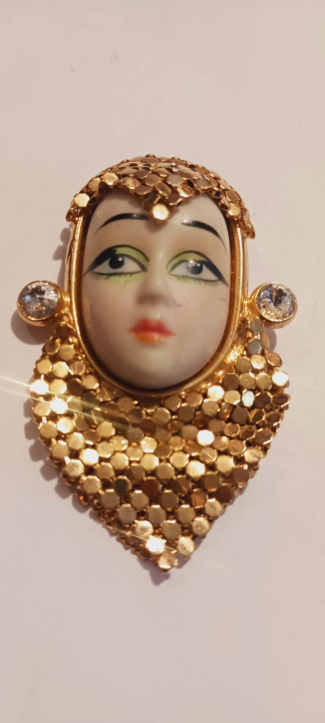 This vintage brooch features a ceramic face with painted details and gold-tone metal accents. It includes two sparkling faux gemstones on the sides and a textured gold-tone surround resembling a headdress and collar. It's a unique statement piece! 3"×2"