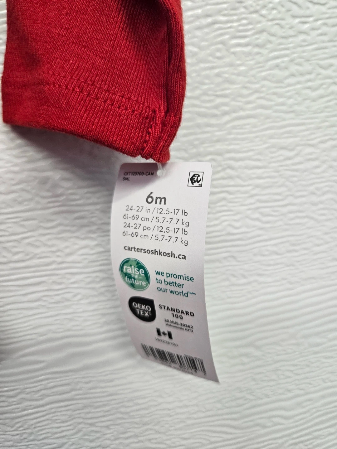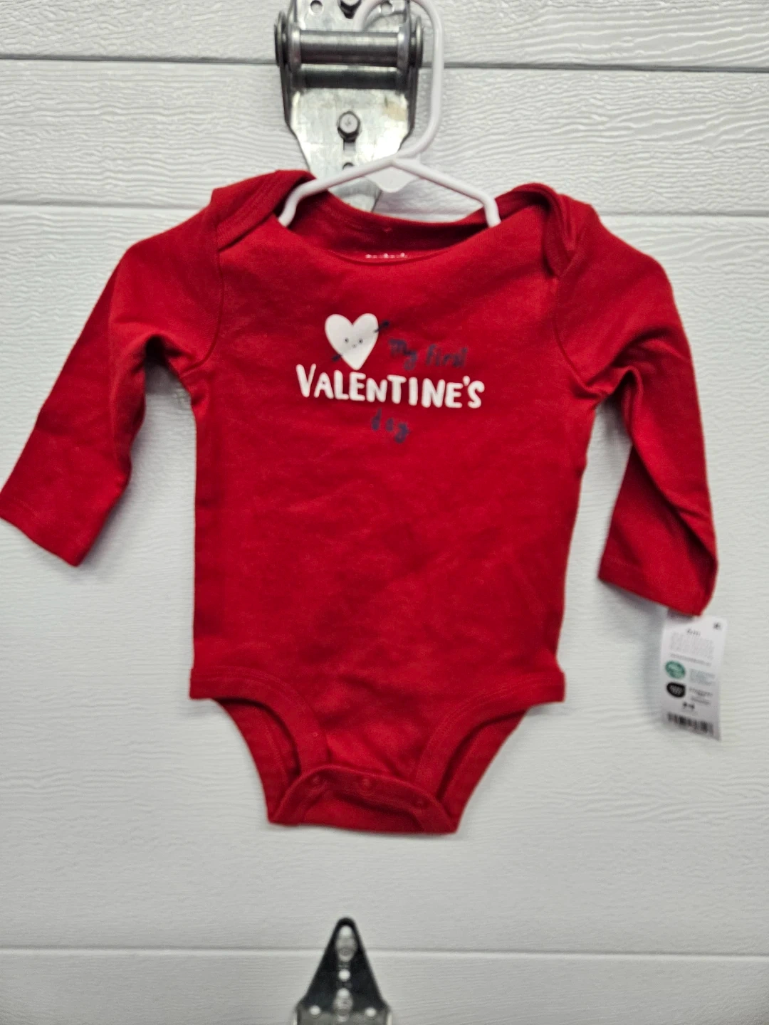 Carter's red long-sleeved bodysuit for baby's first Valentine's Day. Size 6 months. It's made of 100% cotton. This bodysuit is perfect for celebrating your little one's first Valentine's Day!