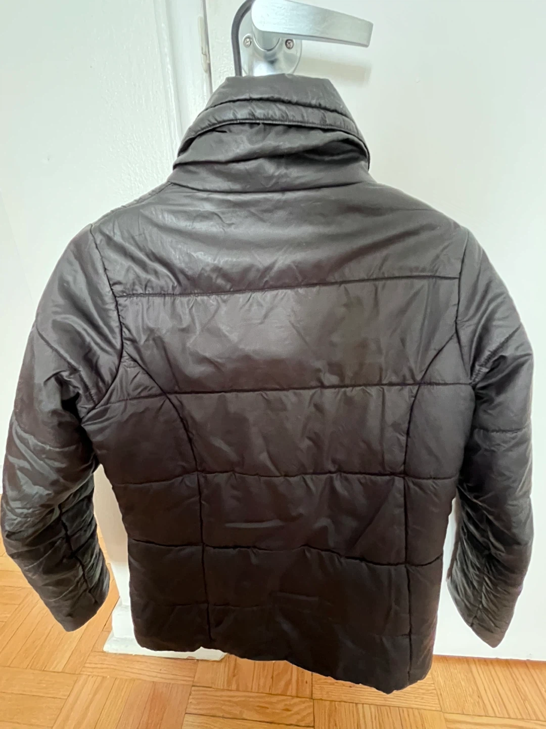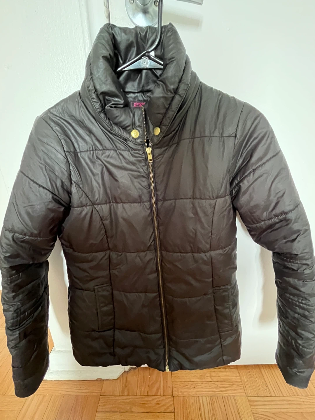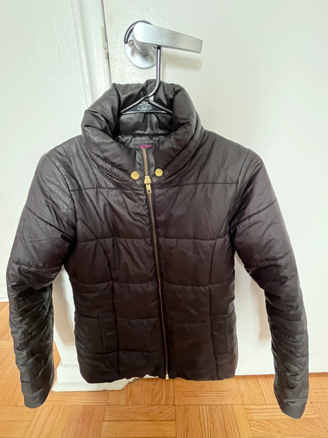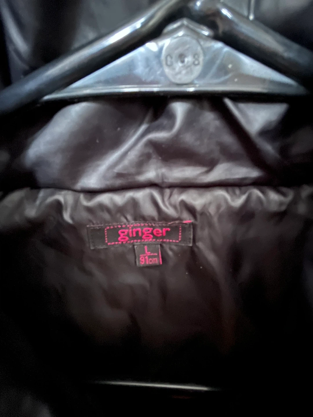 Ginger puffer jacket in black. It's a size large, measuring 91cm. This stylish jacket is perfect for staying warm on chilly days!