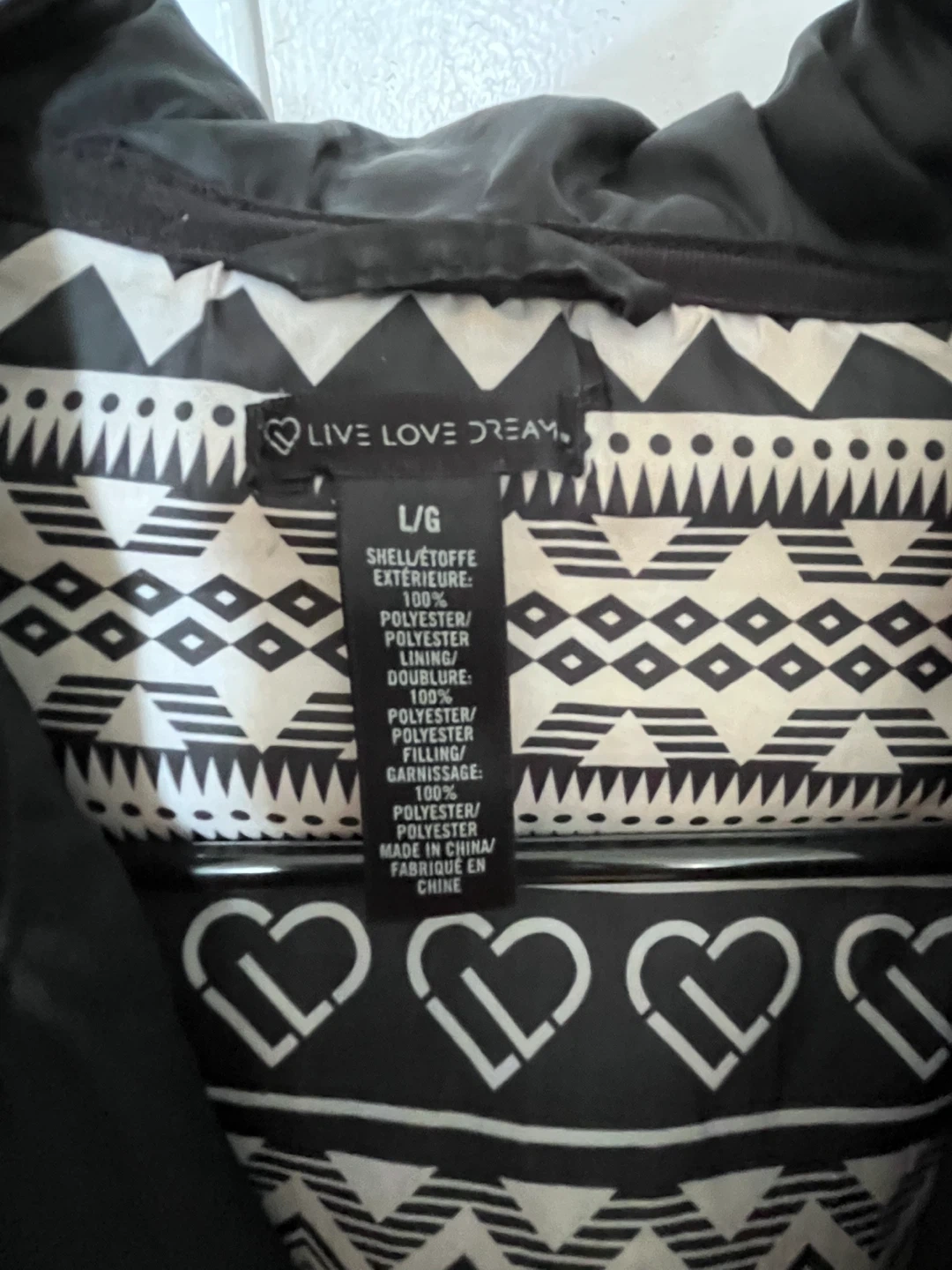 This LIVE LOVE DREAM puffer jacket is black with a patterned interior lining. It's made of 100% polyester. The size is L/G.
