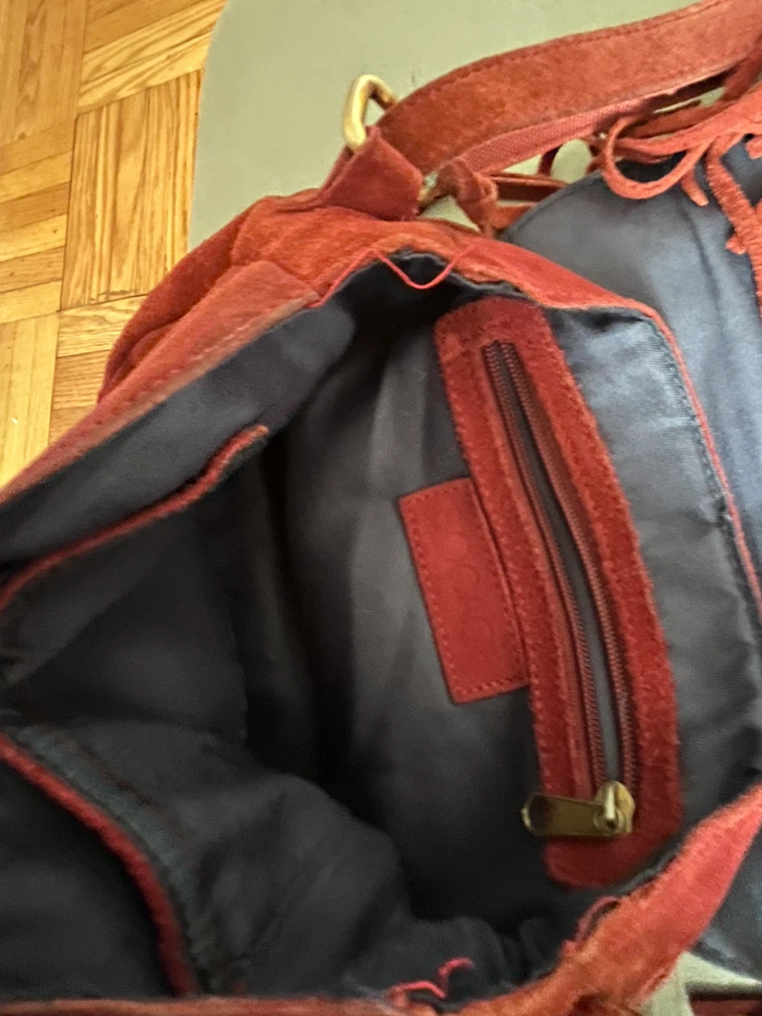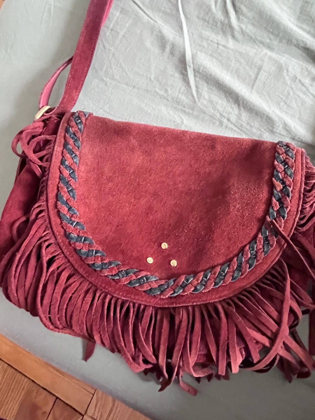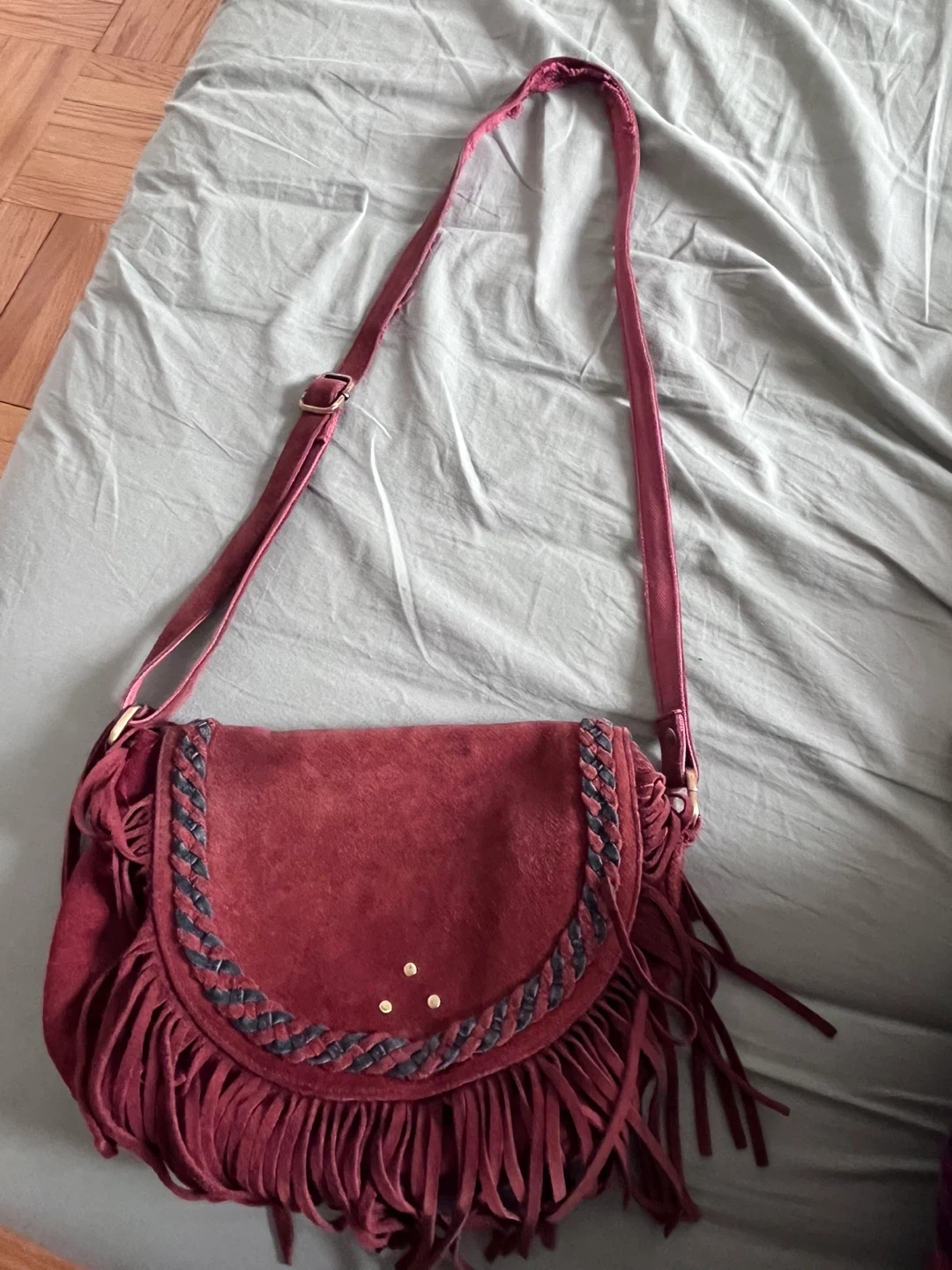 It's a stylish red suede shoulder bag with braided accents and lots of fringe. Features a zippered interior pocket and an adjustable strap. Suede material. One bit of the strap is frayed (see photo) but it’s on the inside so doesn’t show