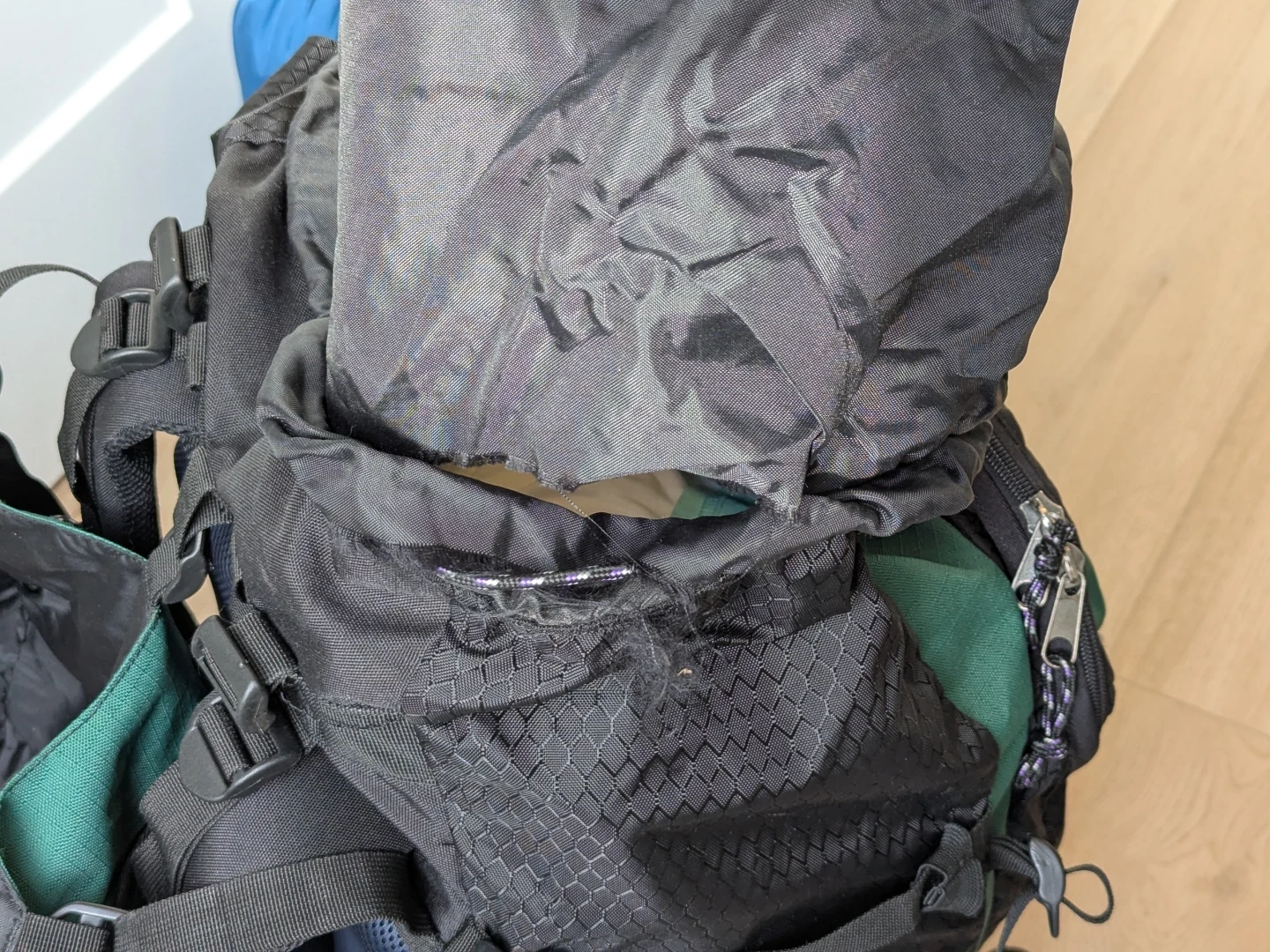 - there is a small tear between the overflow drawstring extension and the top of the main compartment of the bag but this can be easily fixed with a bit of sewing (pictured in last photo)