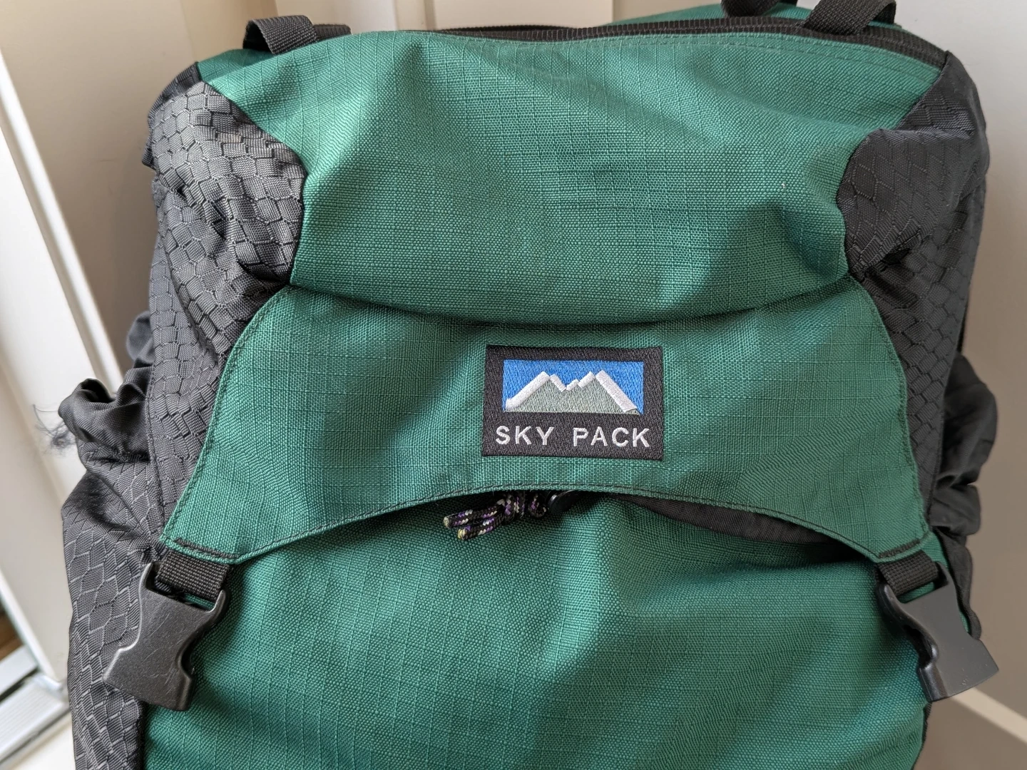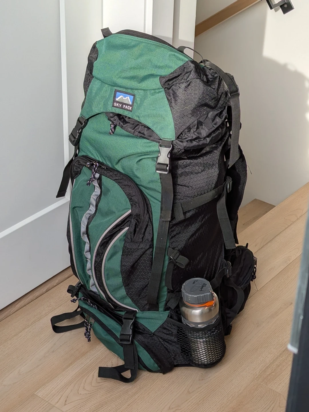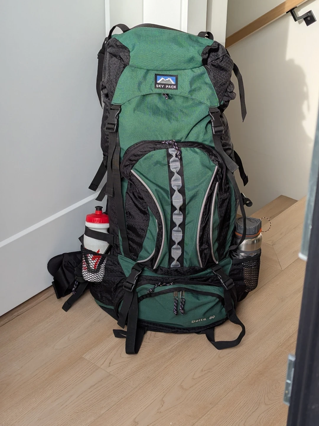 Green and black Sky Pack Delta 40 backpack. It's a large capacity pack with multiple compartments and adjustable straps.