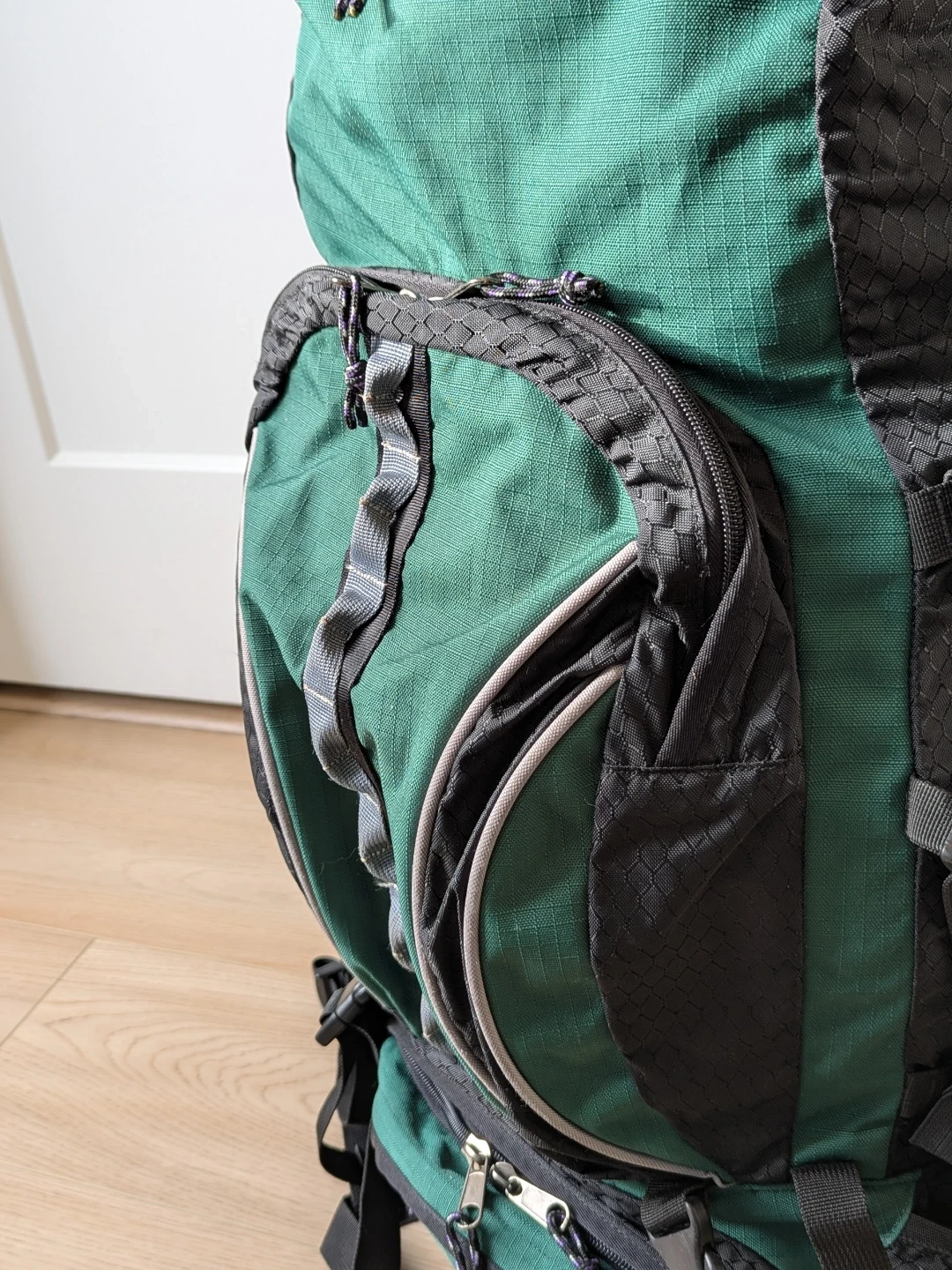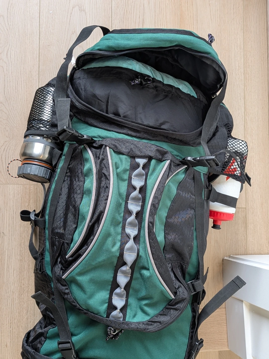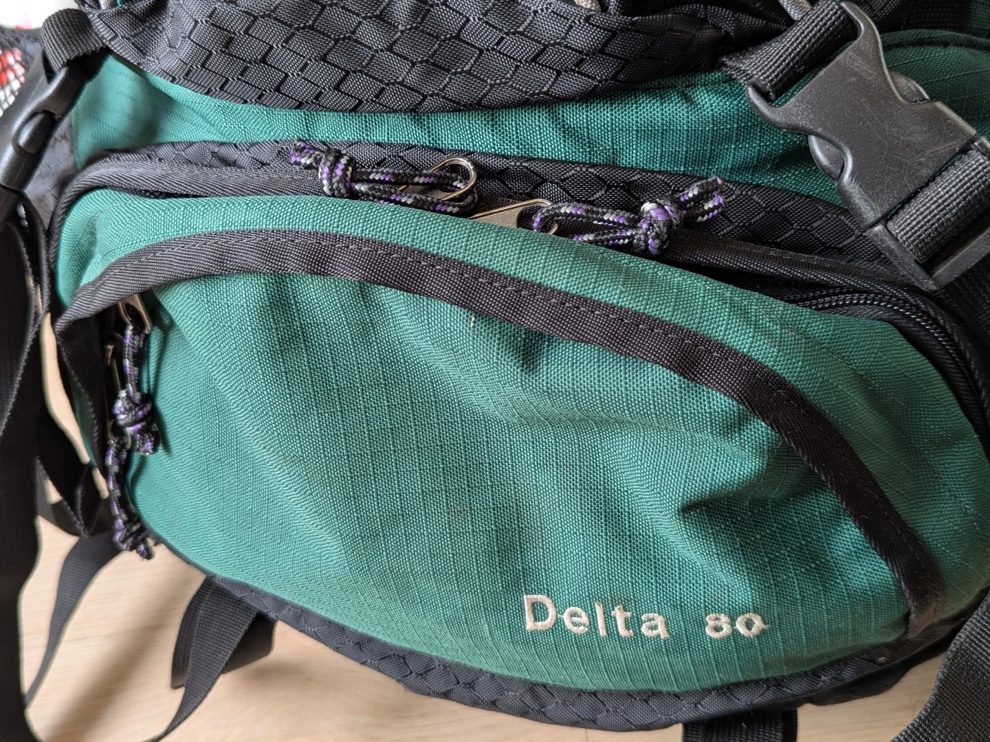 Green and black Sky Pack Delta 40 backpack. It's a large capacity pack with multiple compartments and adjustable straps.