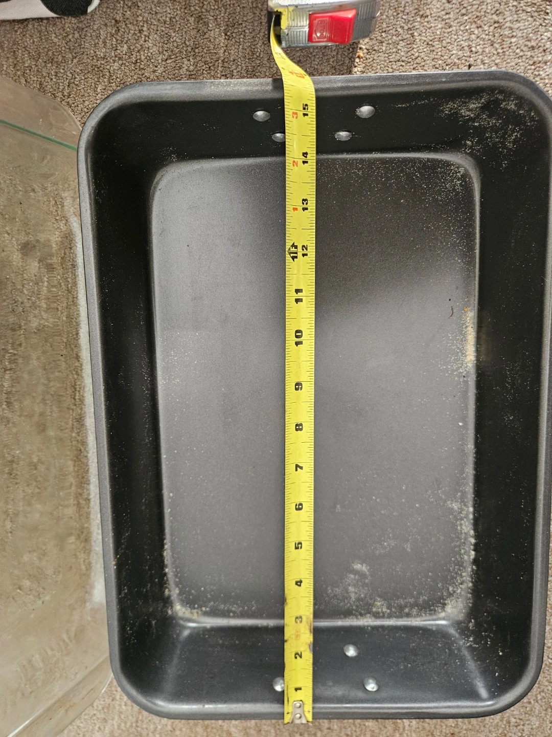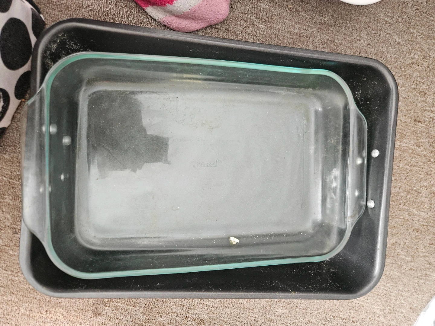 Glass baking dish, Includes a black roasting pan. The roasting pan measures approximately 13 inches by 9.5 inches.
