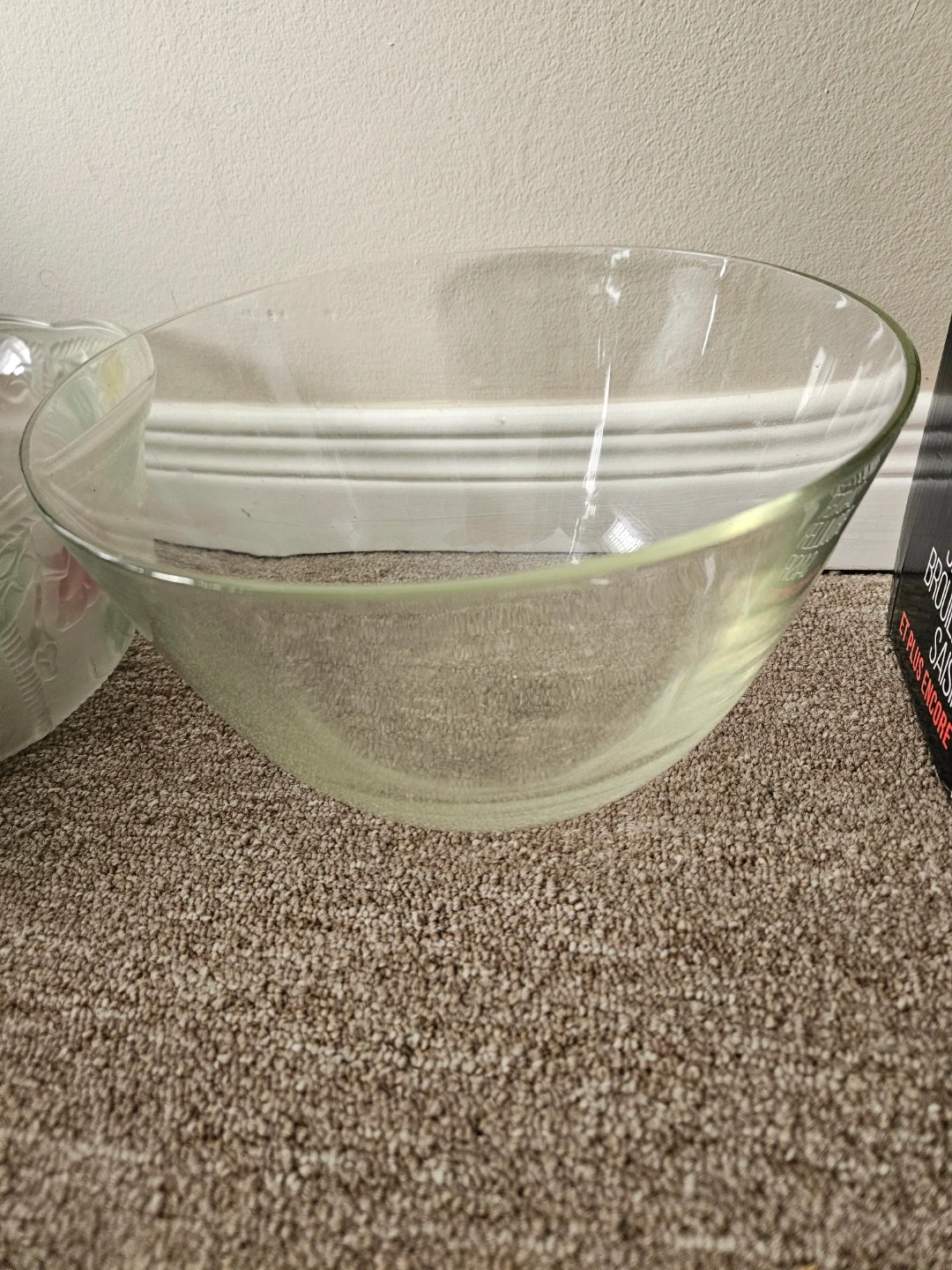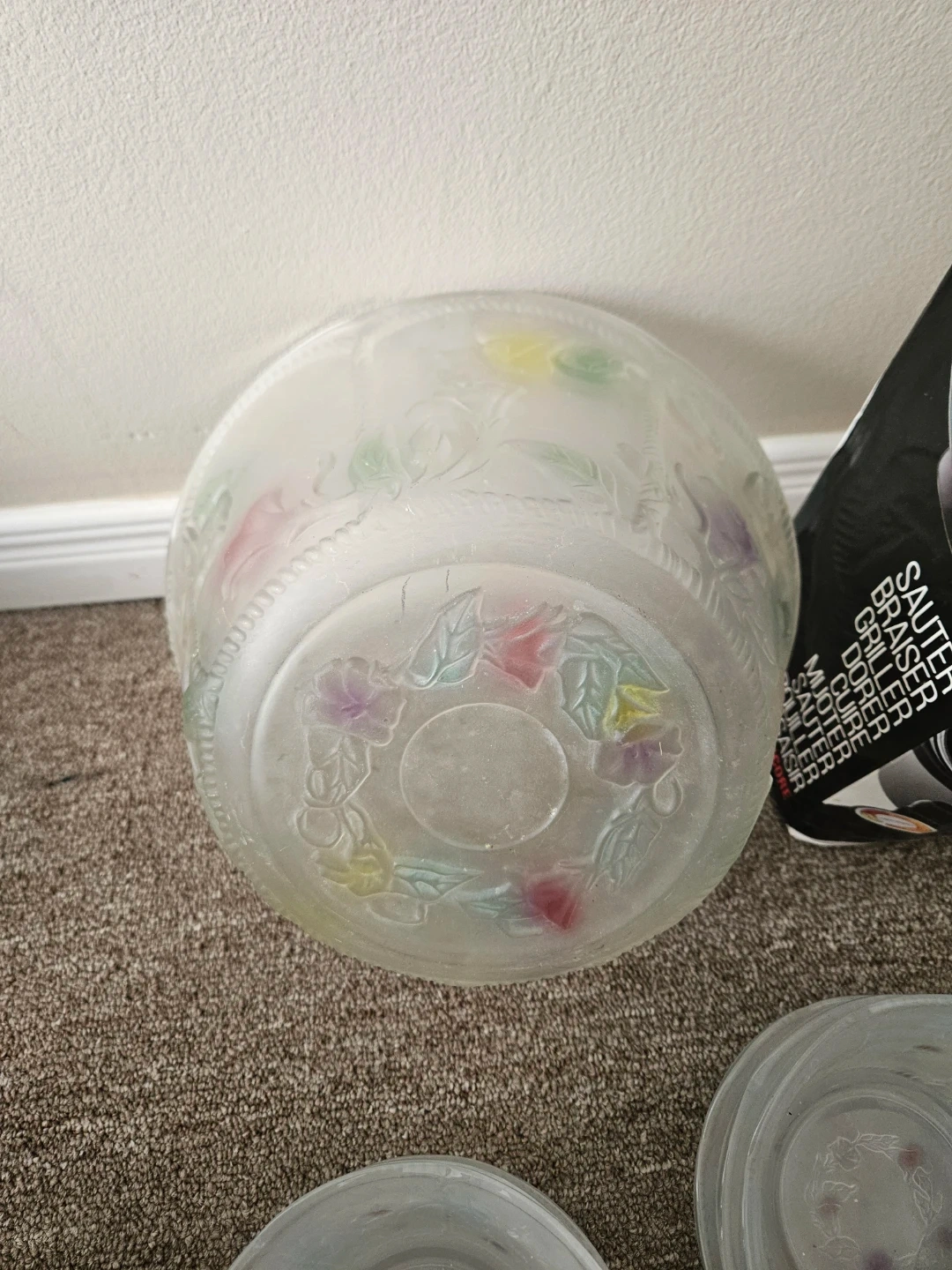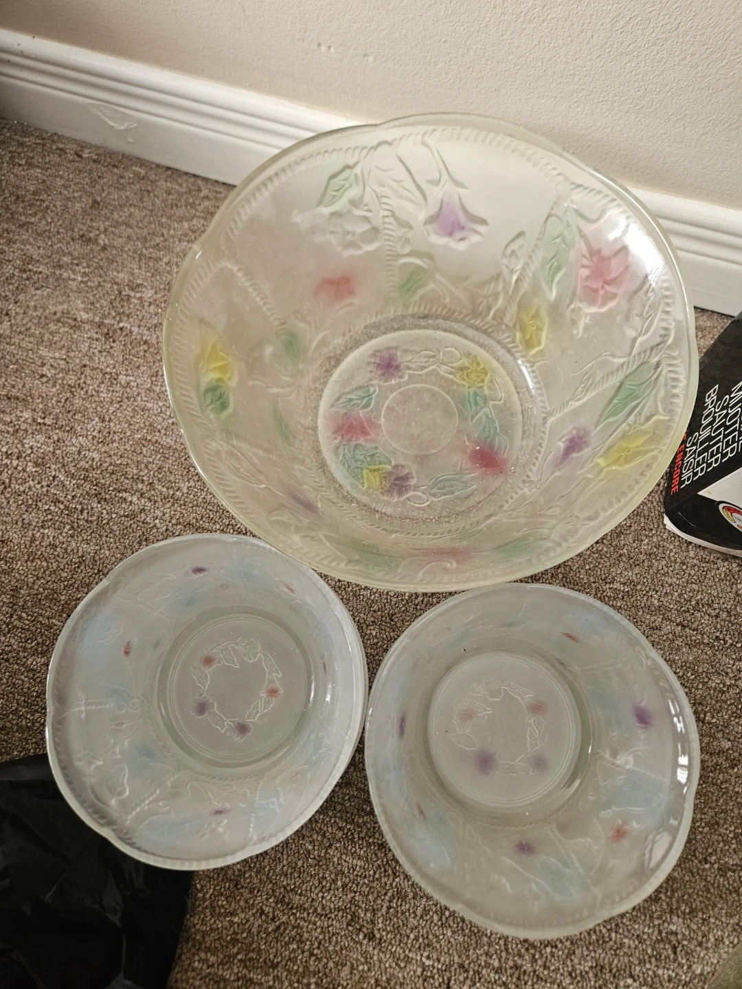 Frosted glass serving bowl set featuring floral embossed designs. Includes one large serving bowl and 6 smaller bowls. Great for snacks or side dishes!