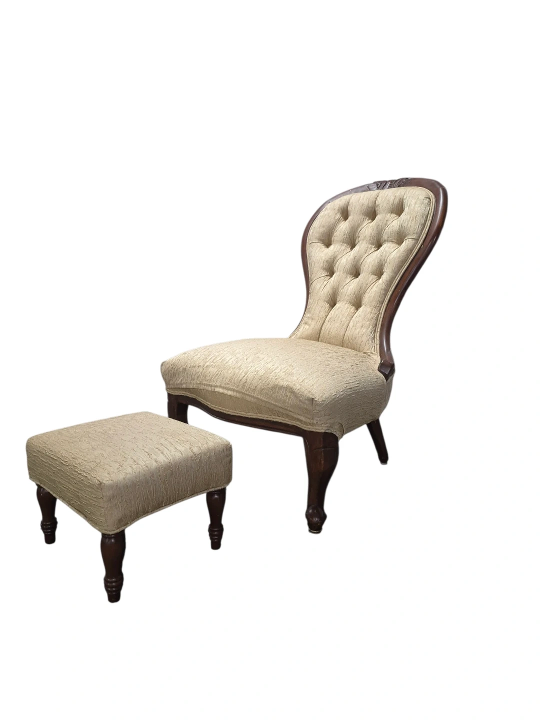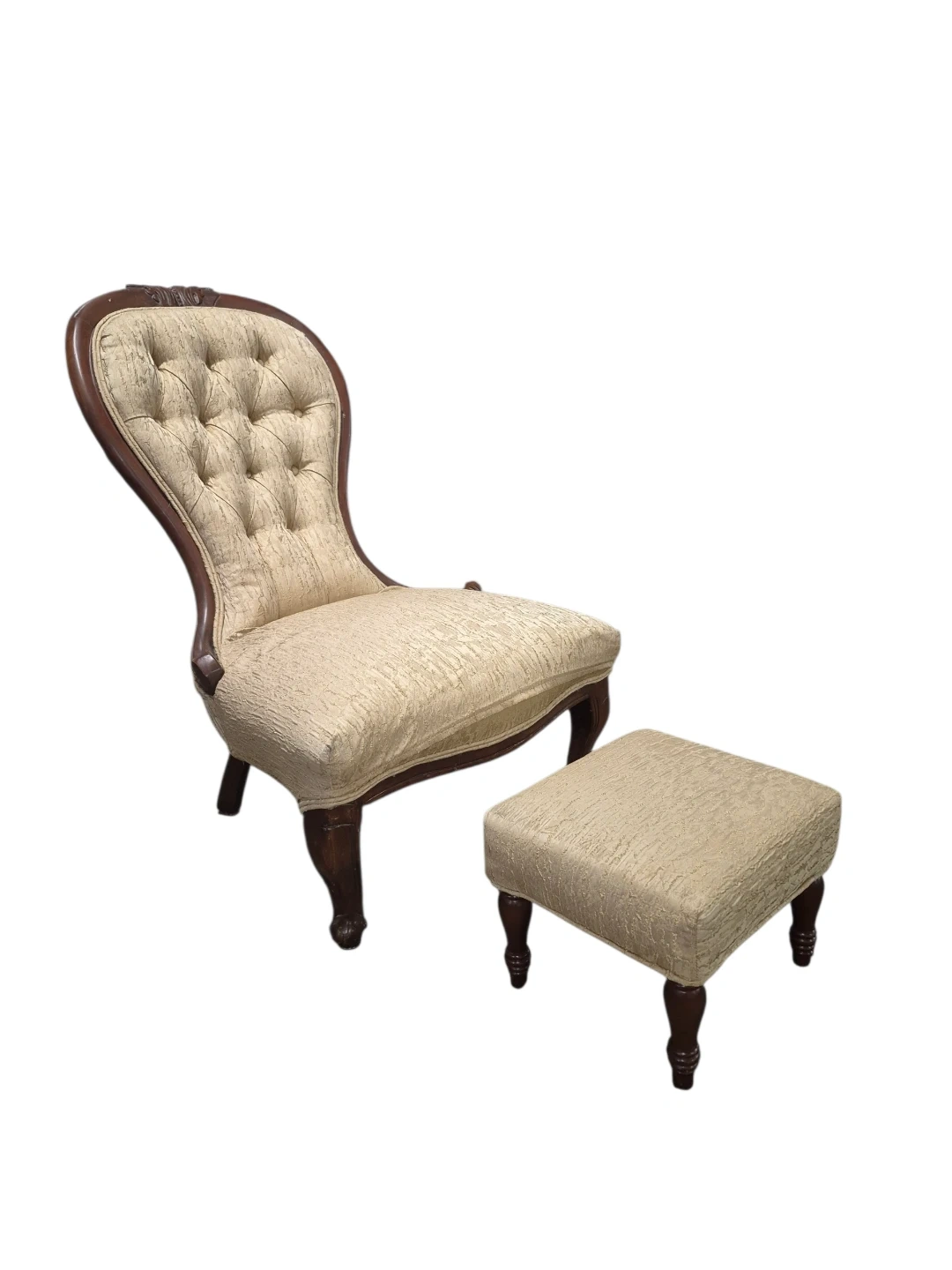This is a tufted accent chair with a matching ottoman. The set features dark wood legs and a textured beige fabric upholstery. It's a lovely vintage-style piece for any room.
