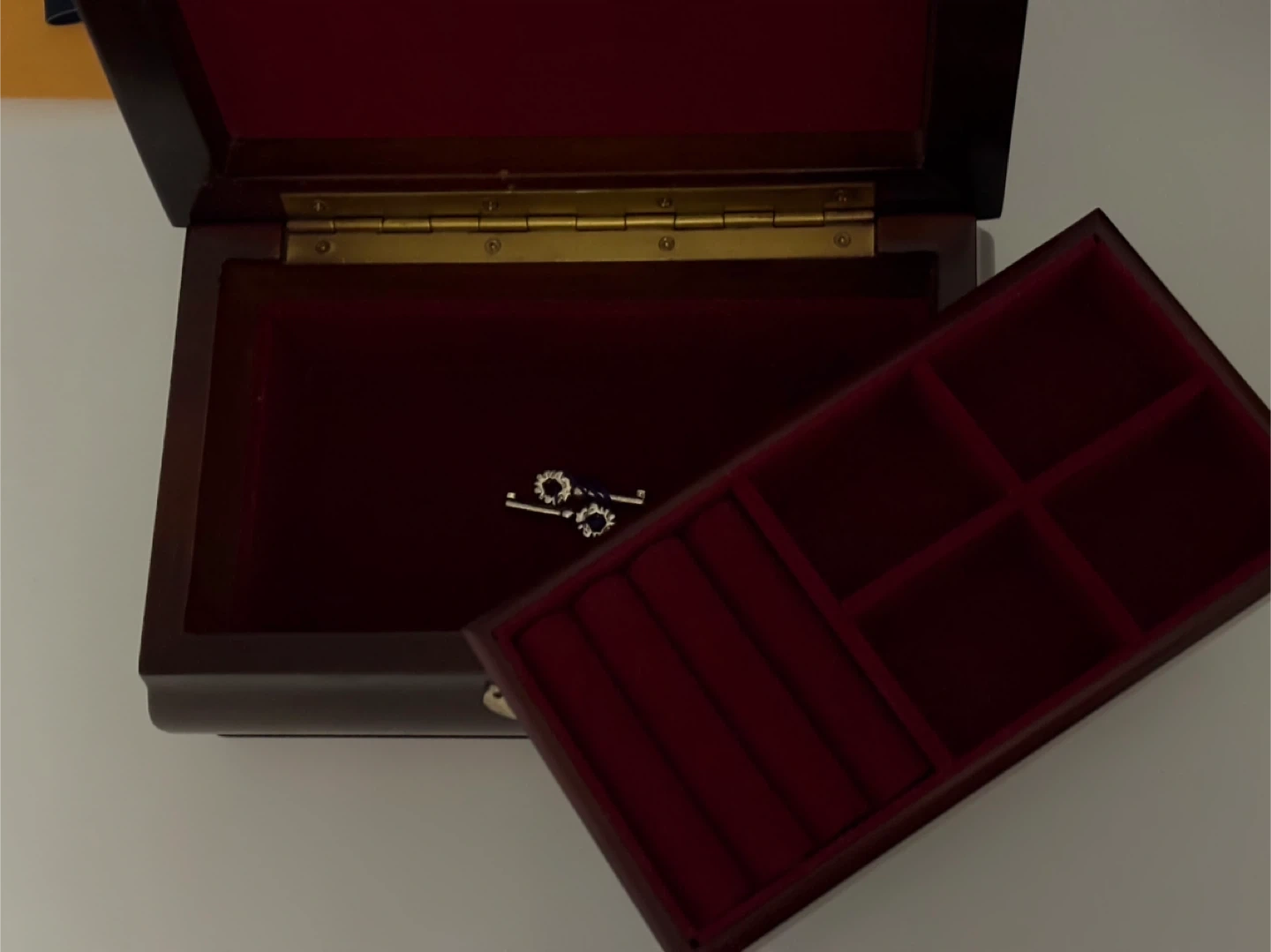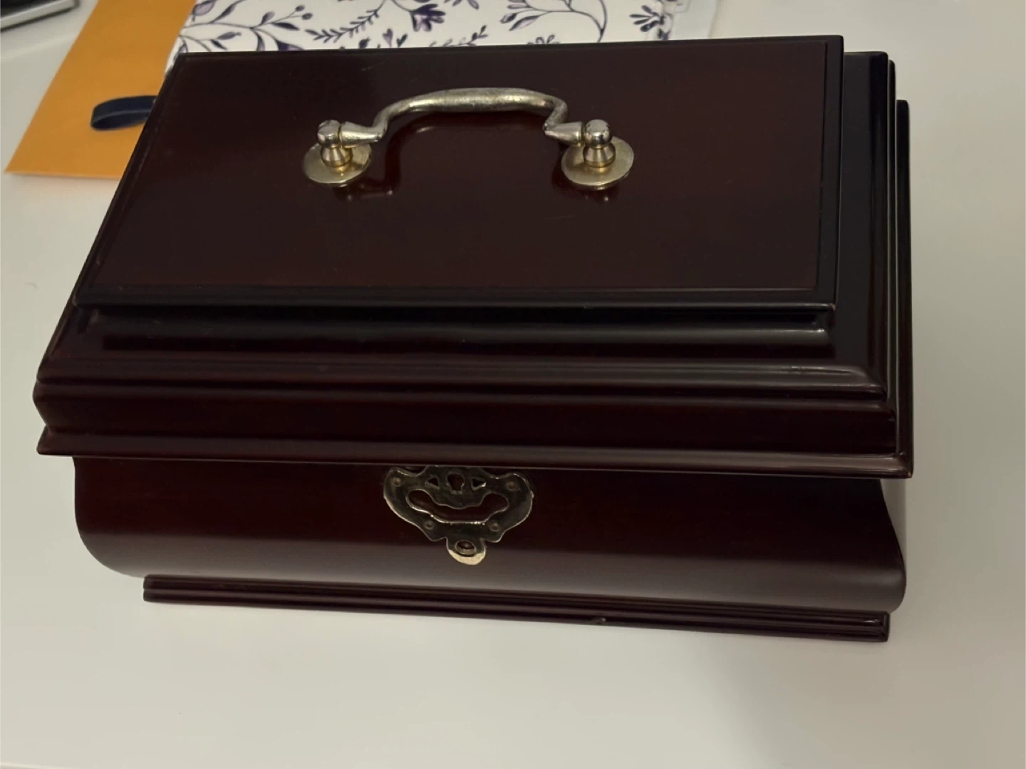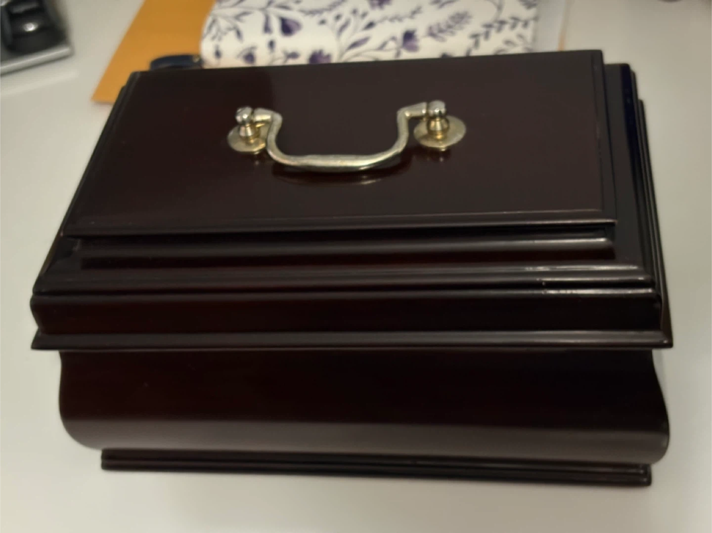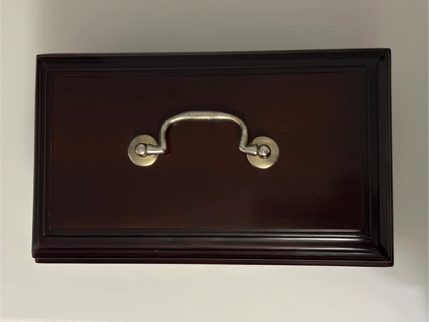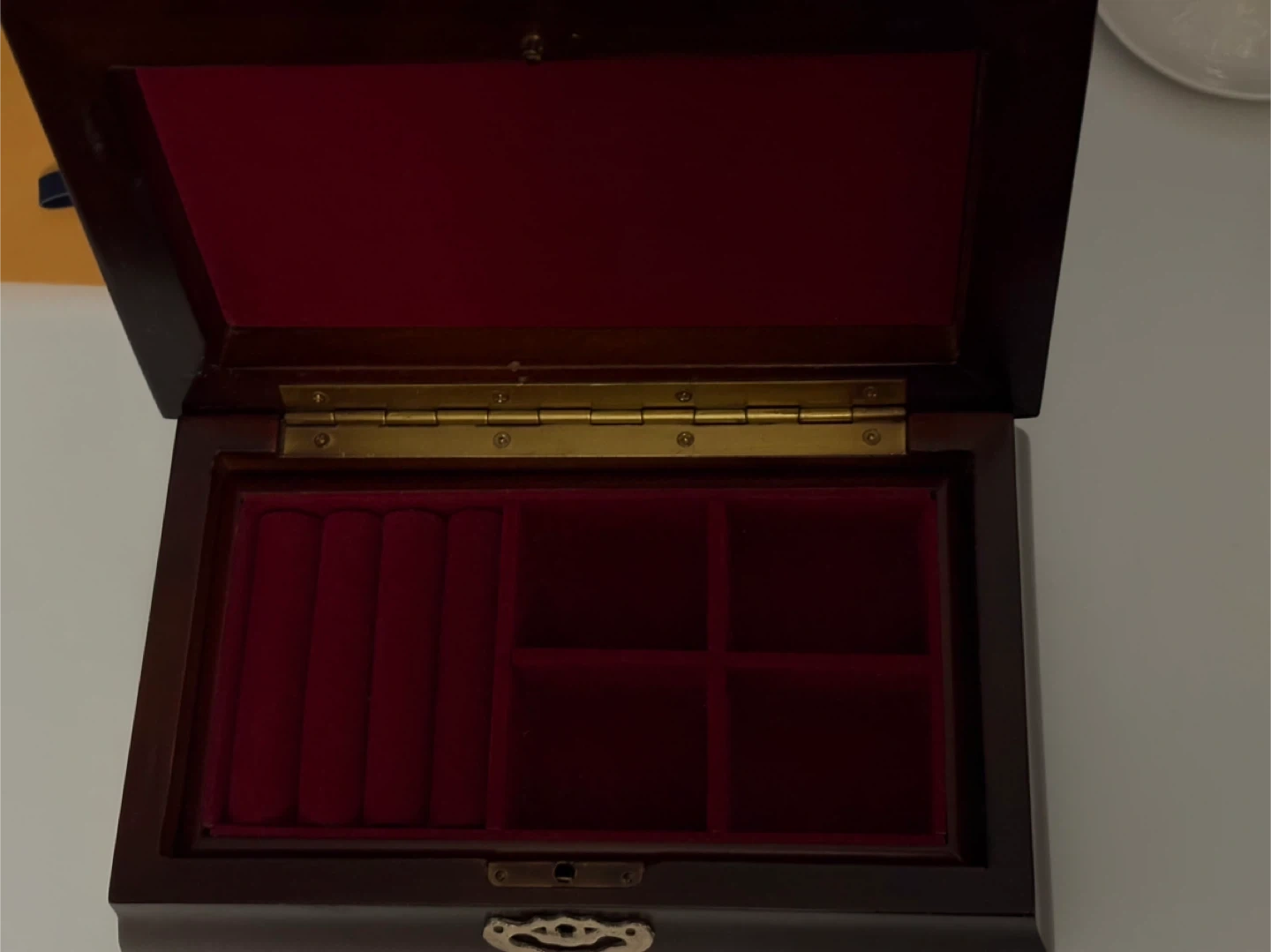 Vinyage Bowring & Co. This is a dark wood jewellery box with a red velvet lining. It has multiple compartments for storing rings and other small items. The latch and handle are silver-toned.
