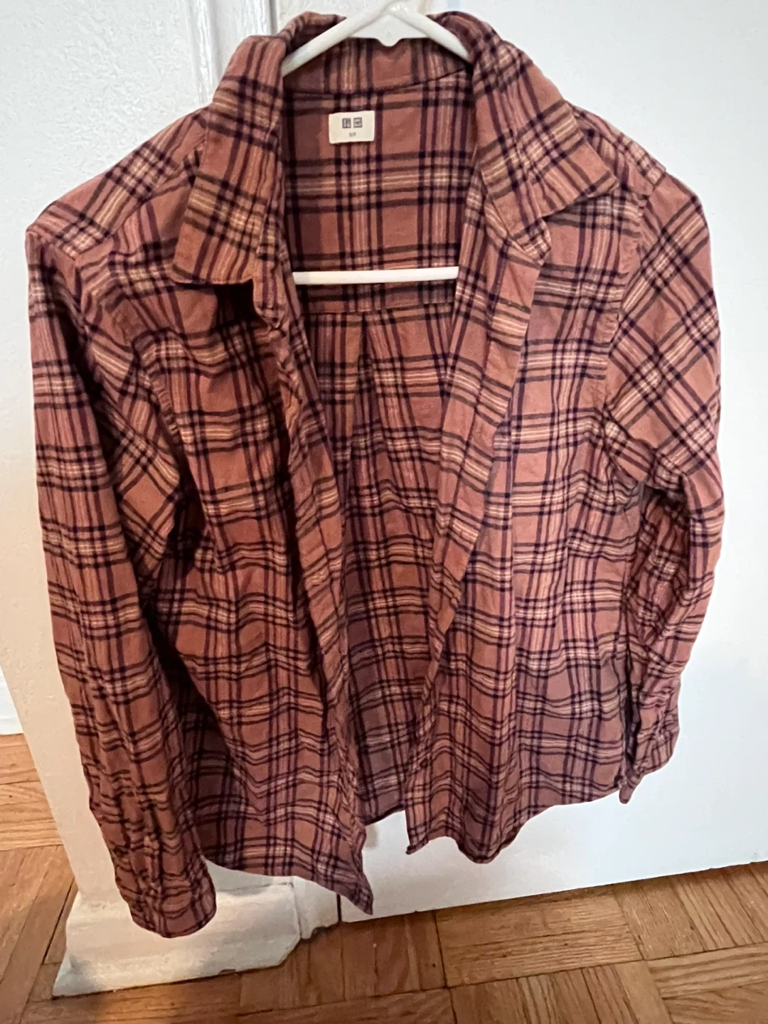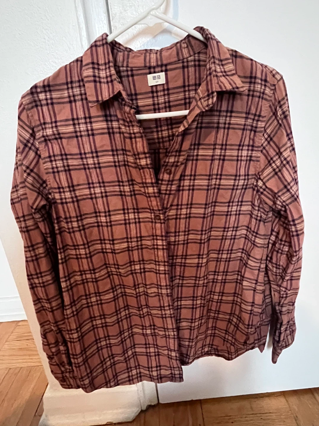 This Uniqlo flannel shirt features a classic plaid pattern. It's a size S/P. Perfect for layering or wearing on its own!