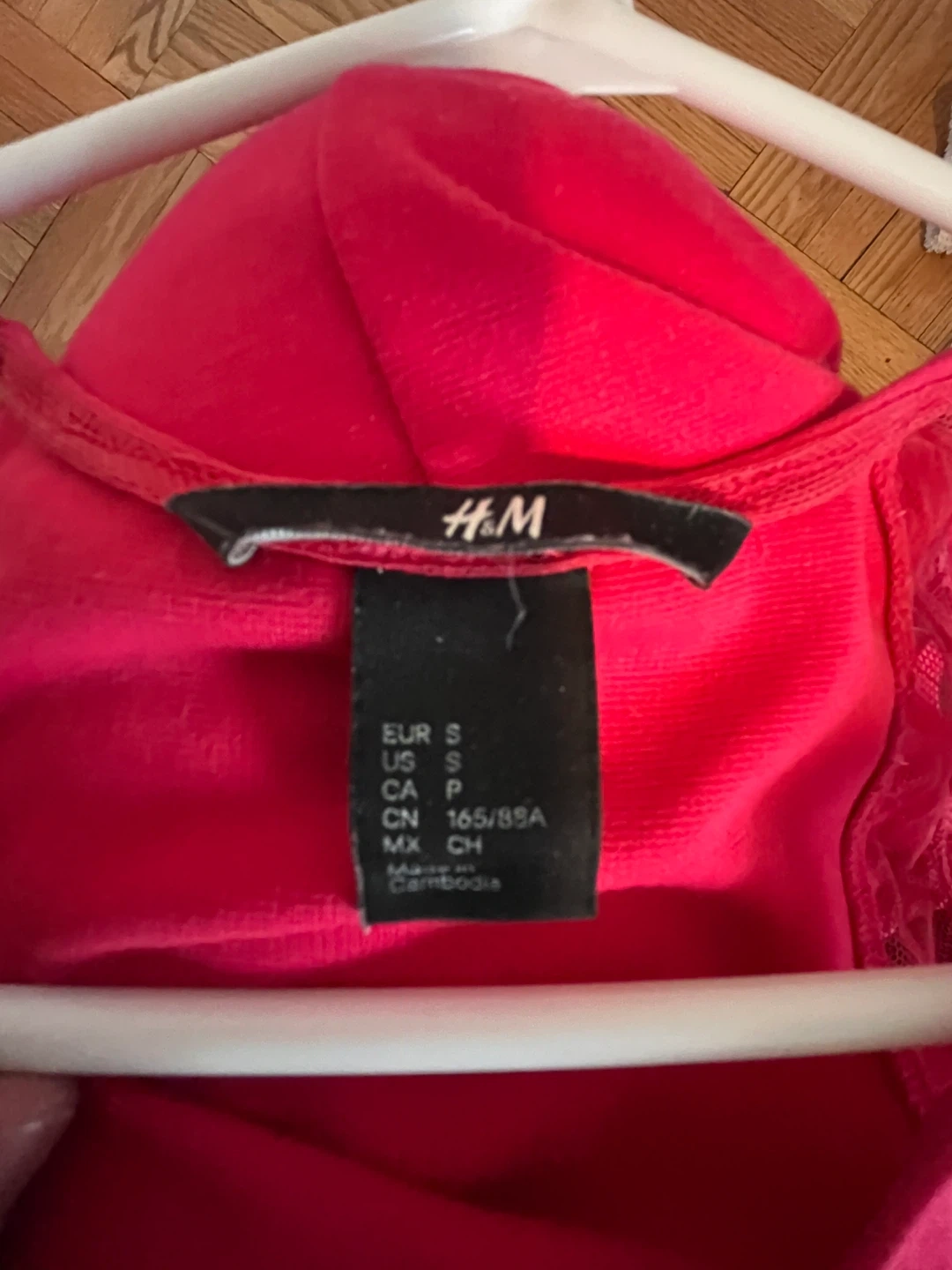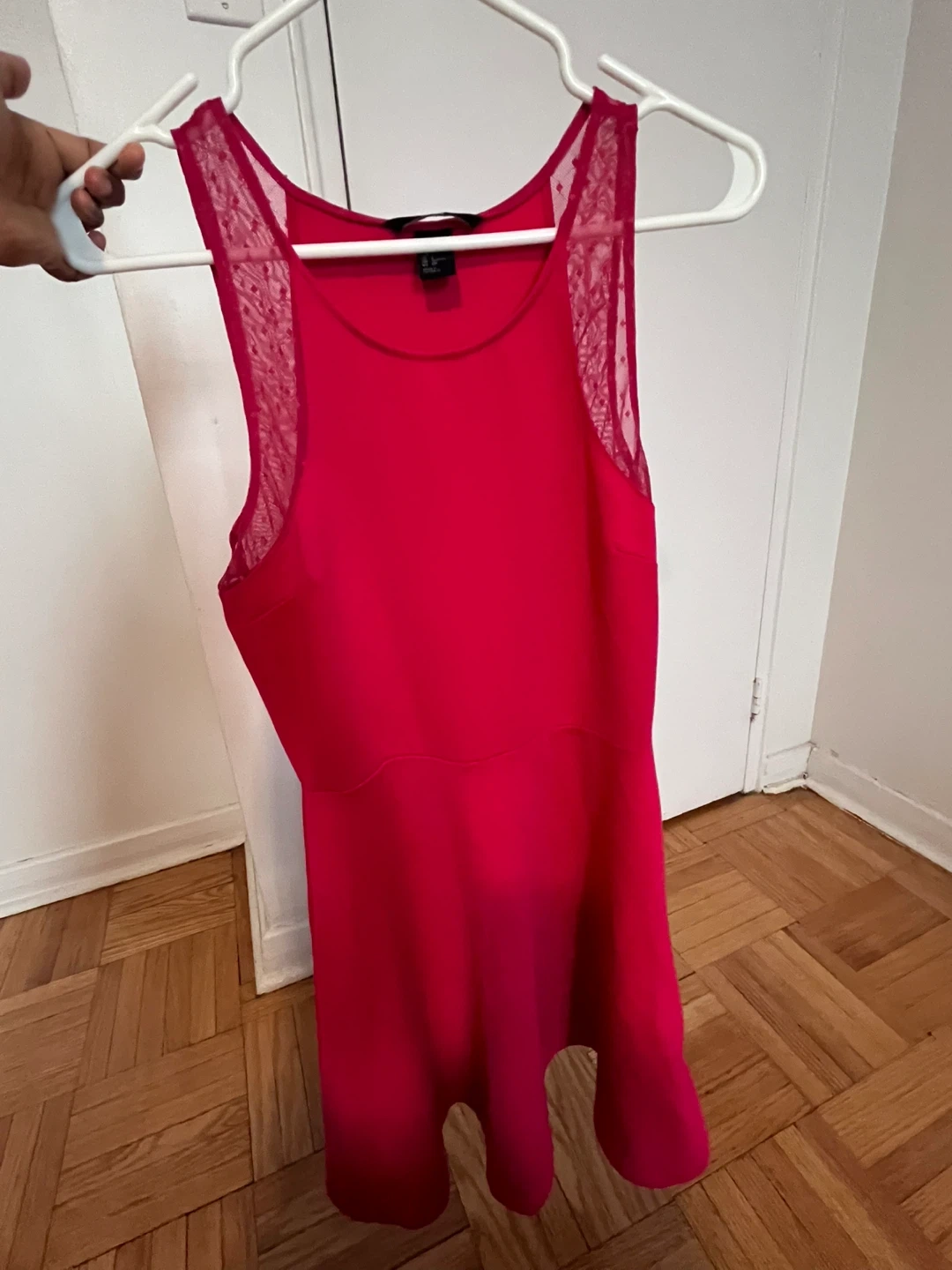 This H&M dress is a vibrant pink with delicate lace detailing on the shoulders. It's a size small, perfect for a fun outing!