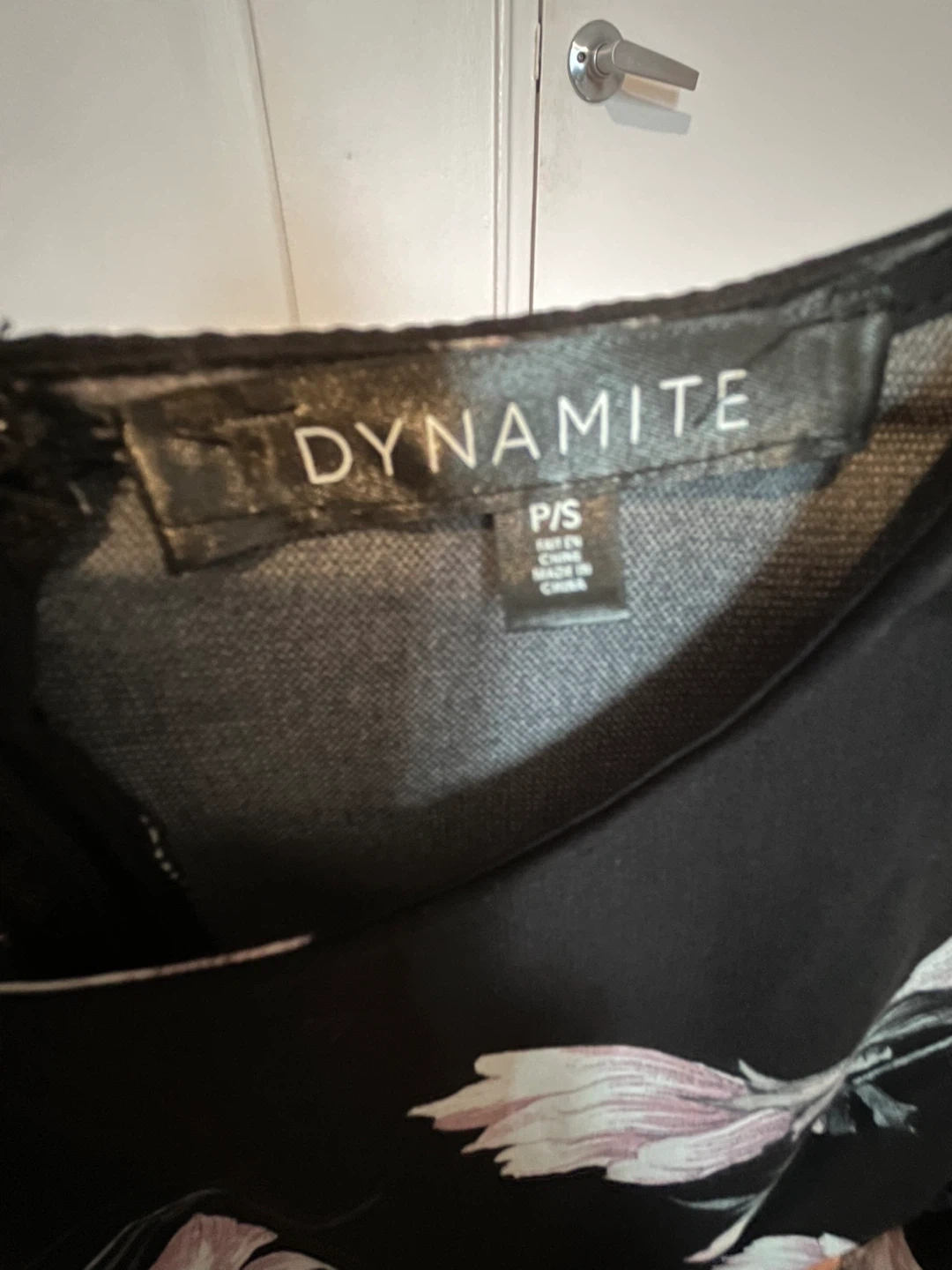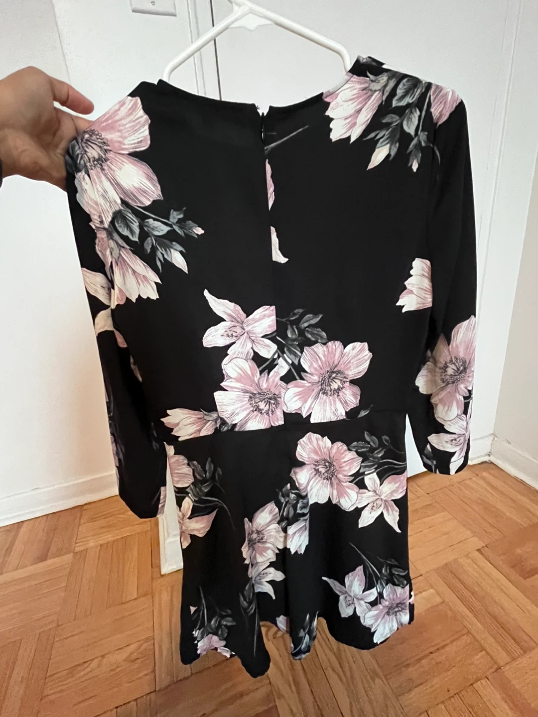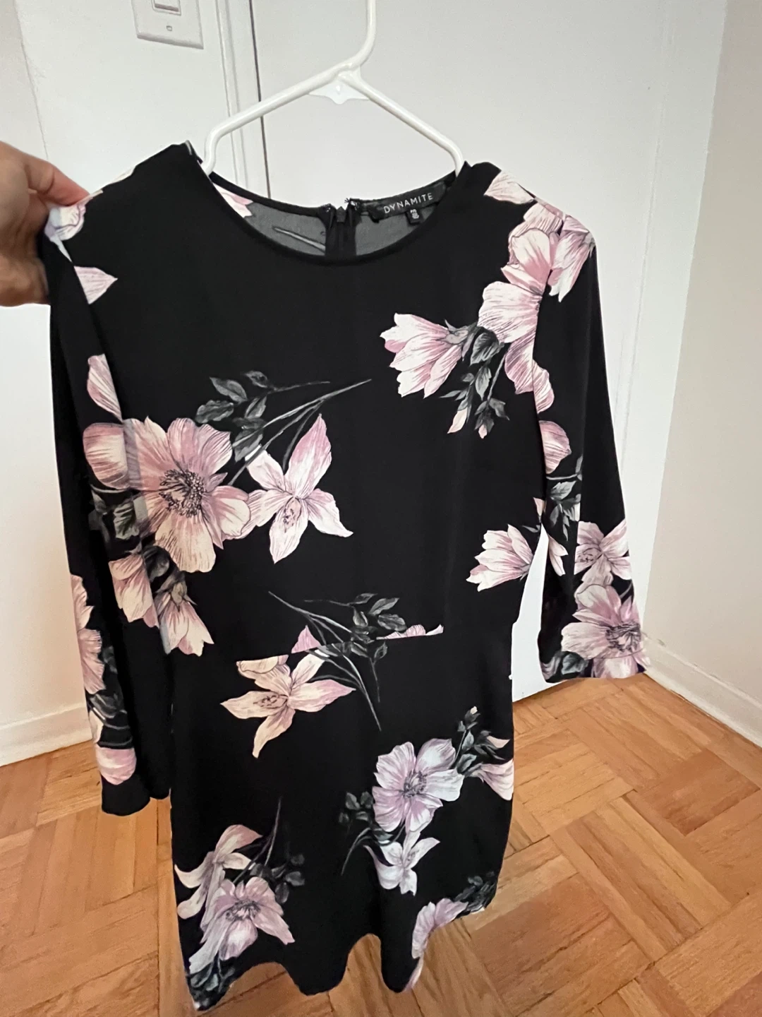 This Dynamite dress features a bold black base with a pretty pink floral print. It has long sleeves and a comfortable fit. A lovely option for a casual outing!