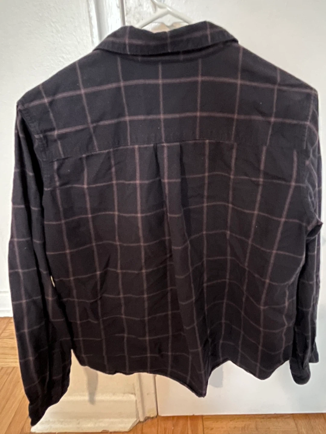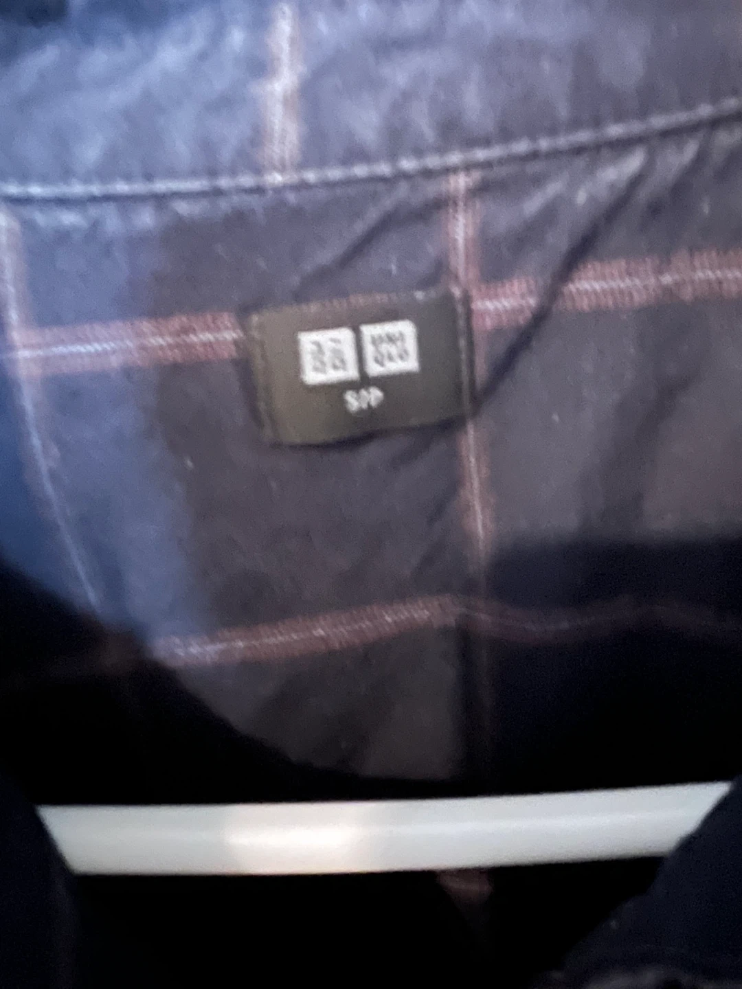 This is a Uniqlo long-sleeve button-up shirt with a plaid pattern. It's a size small. Made with a comfortable fabric blend.