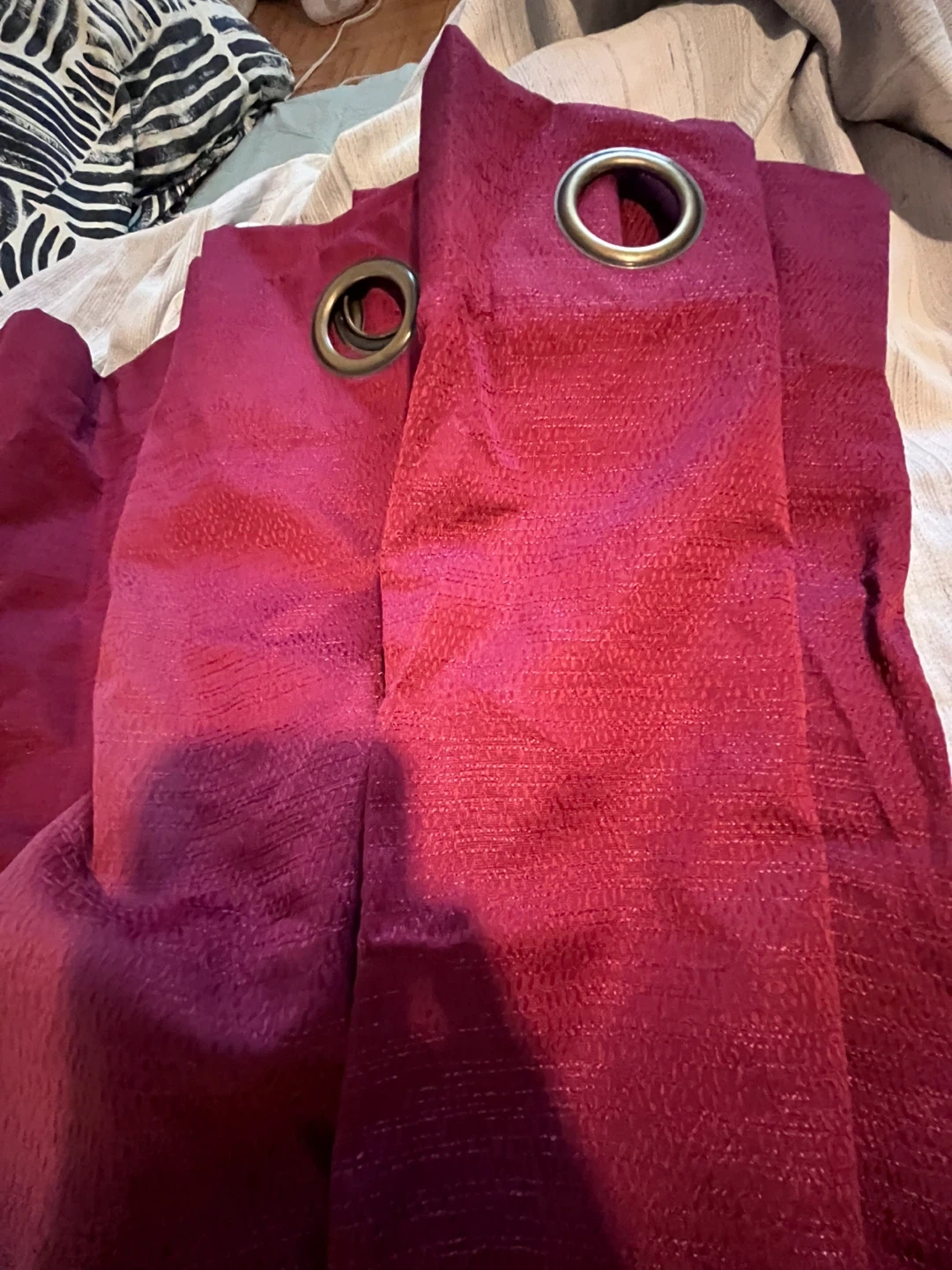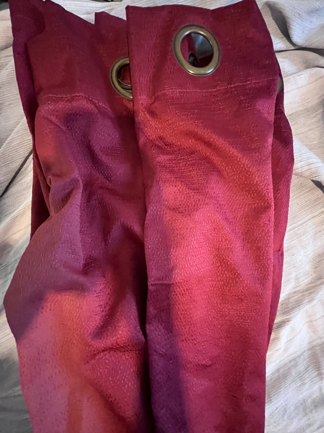 One maroon curtain with grommets. This curtain add a rich colour to any room. made from a textured fabric.