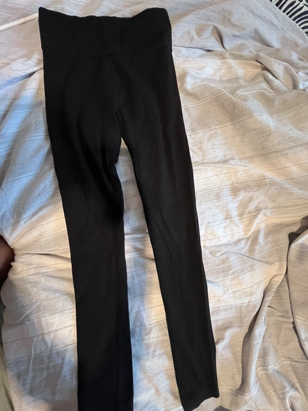 These are black leggings from Forever 21. They're made of a cotton blend material. Great for everyday wear!