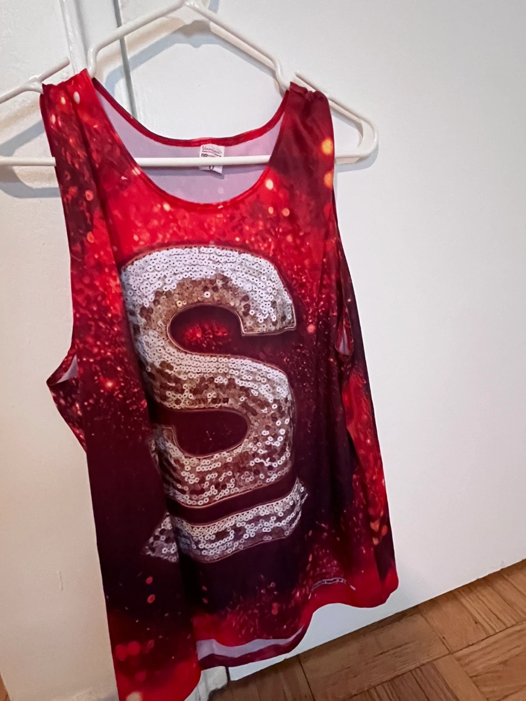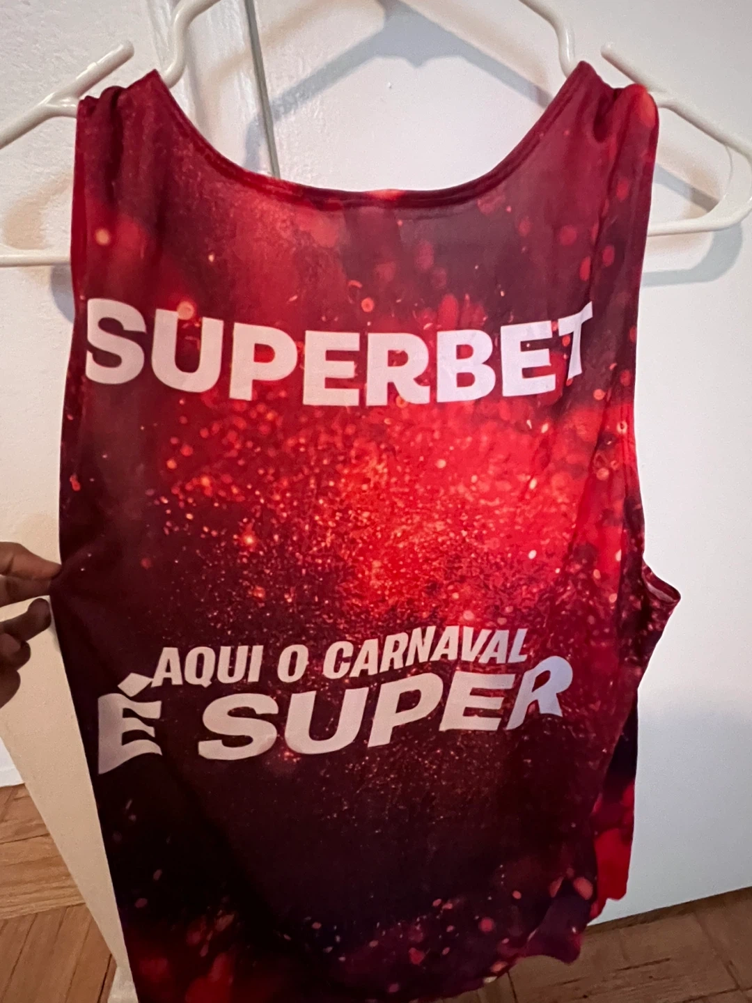 This Vanini tank top features a vibrant red design with "SUPERBET" and "AQUI O CARNAVAL É SUPER" text. It has a large sequined 'S' on the front. Made of lightweight material for comfort.