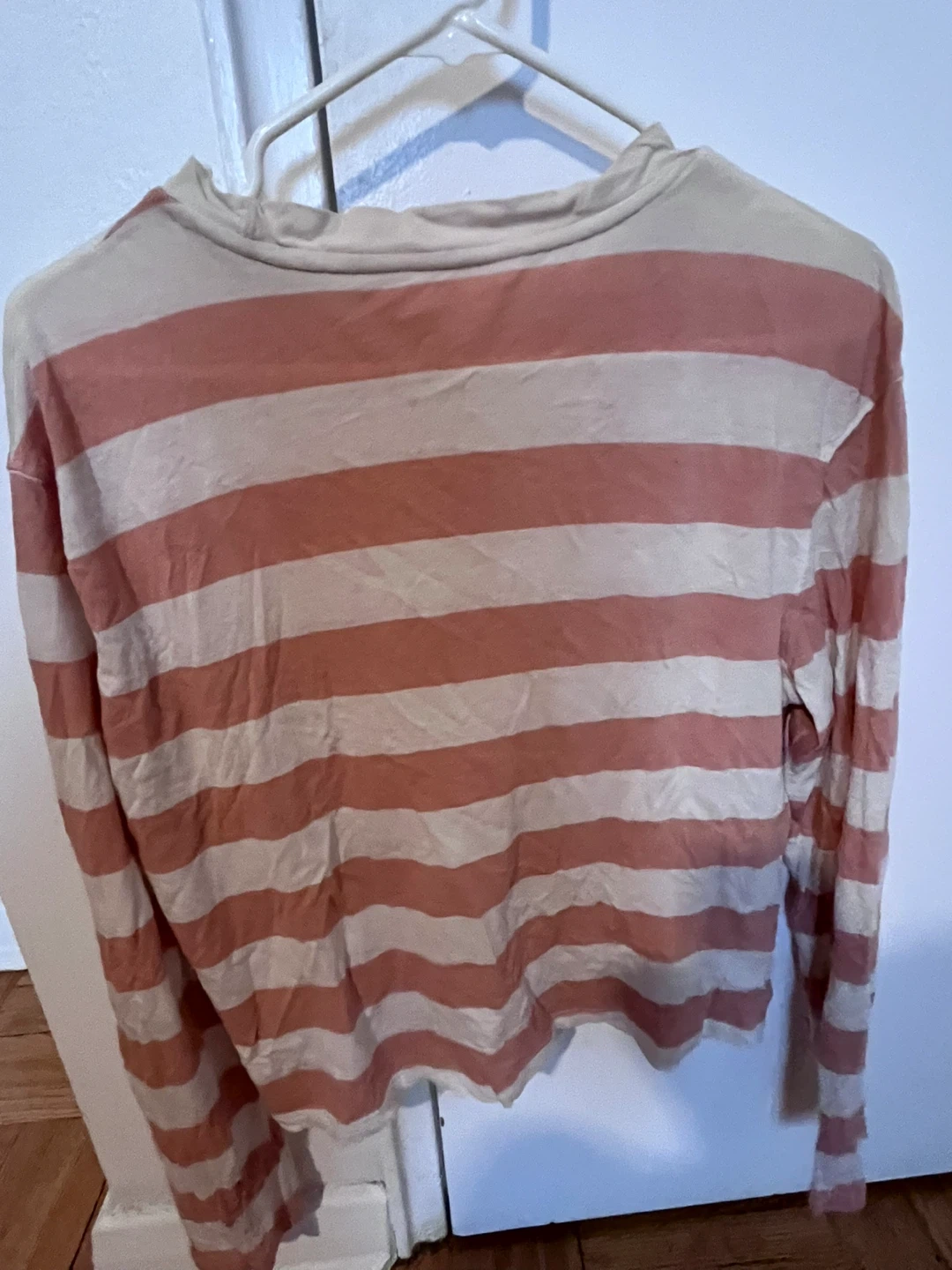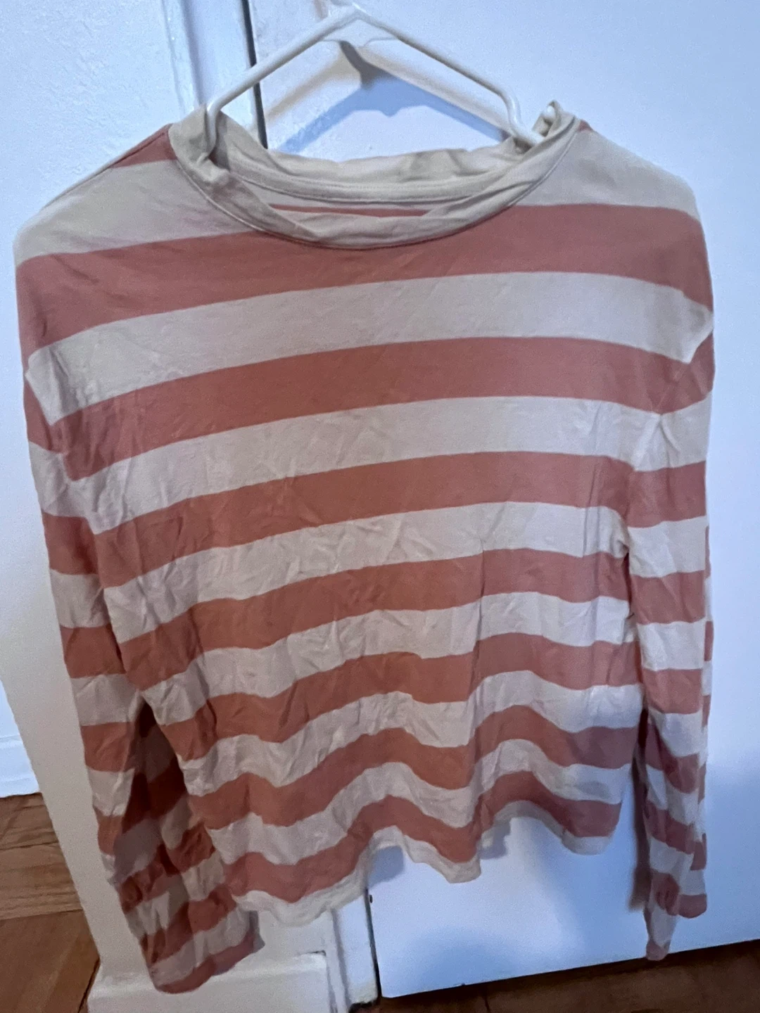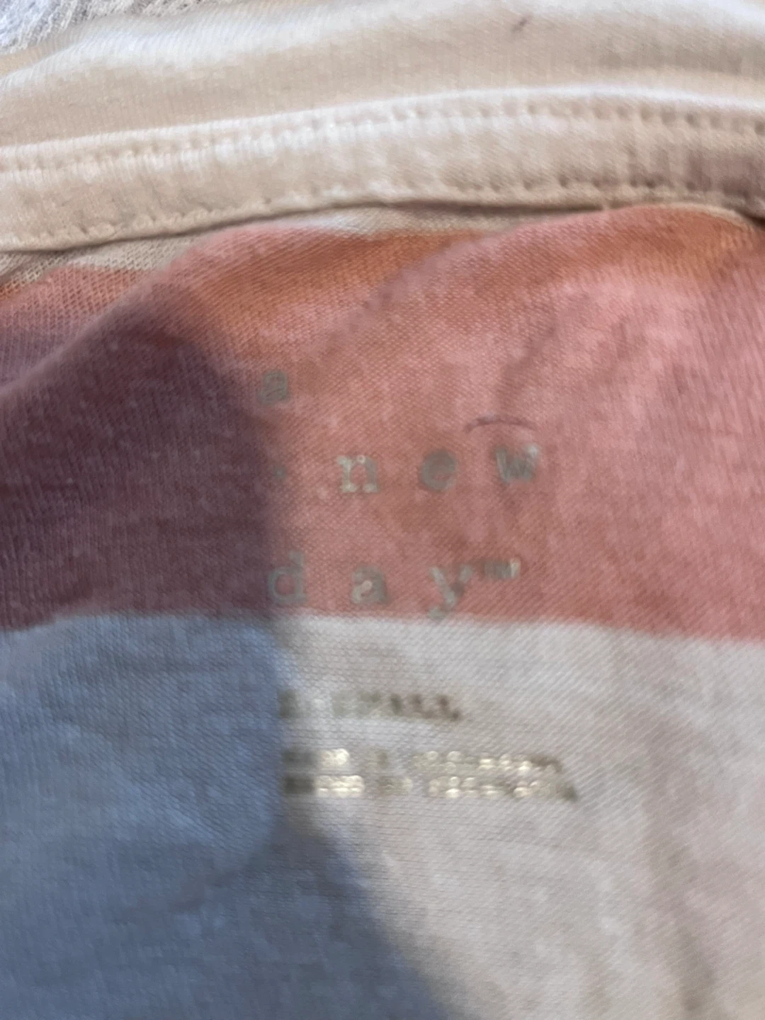 This is an A New Day long sleeve t-shirt. It's made of a soft material with horizontal stripes in pink and cream. Size is XS.