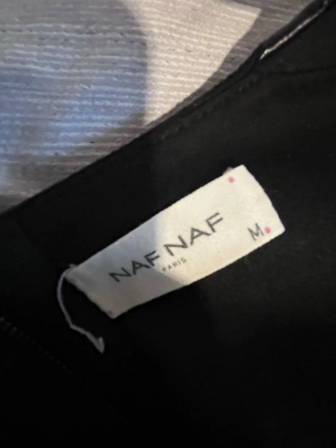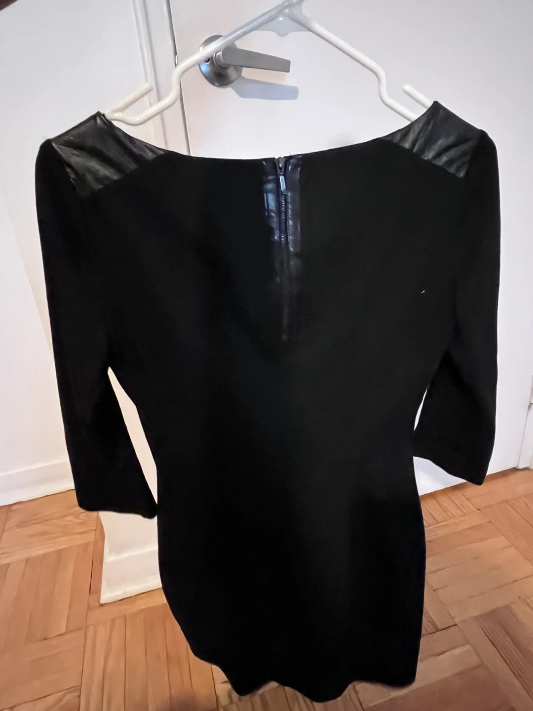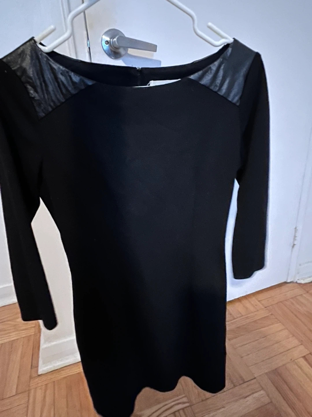 This NAF NAF dress is black with faux leather accents on the shoulders. It's a size medium with a back zipper closure. Perfect for dressing up or down!