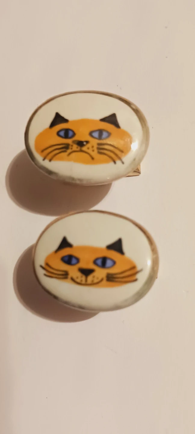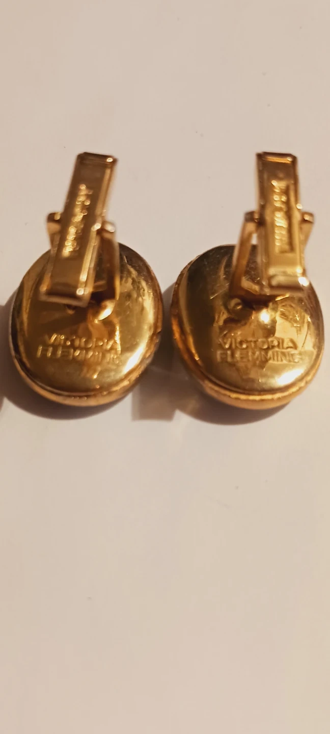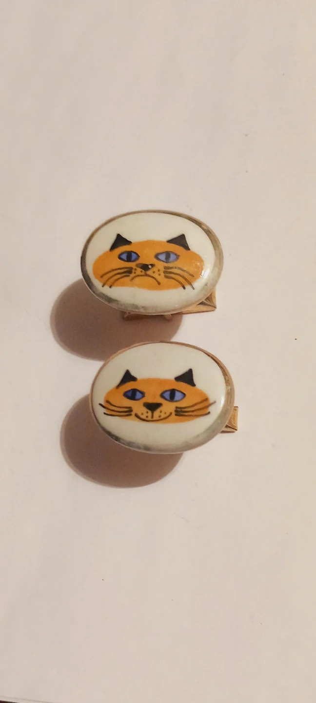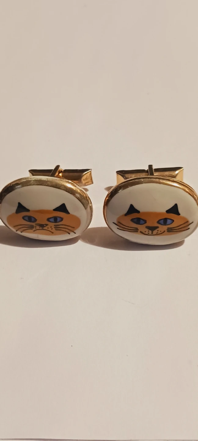 VICTORIA FLEMMING DESIGNER SIGNED oval cufflinks featuring a charming cat face design. Gold-tone metal with white enamel. This set would add a playful touch to any formal wear! 1"×1". ALL MY PRICES ARE NEGOTIABLE !!
