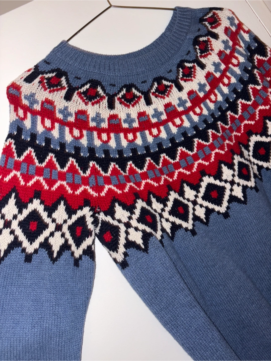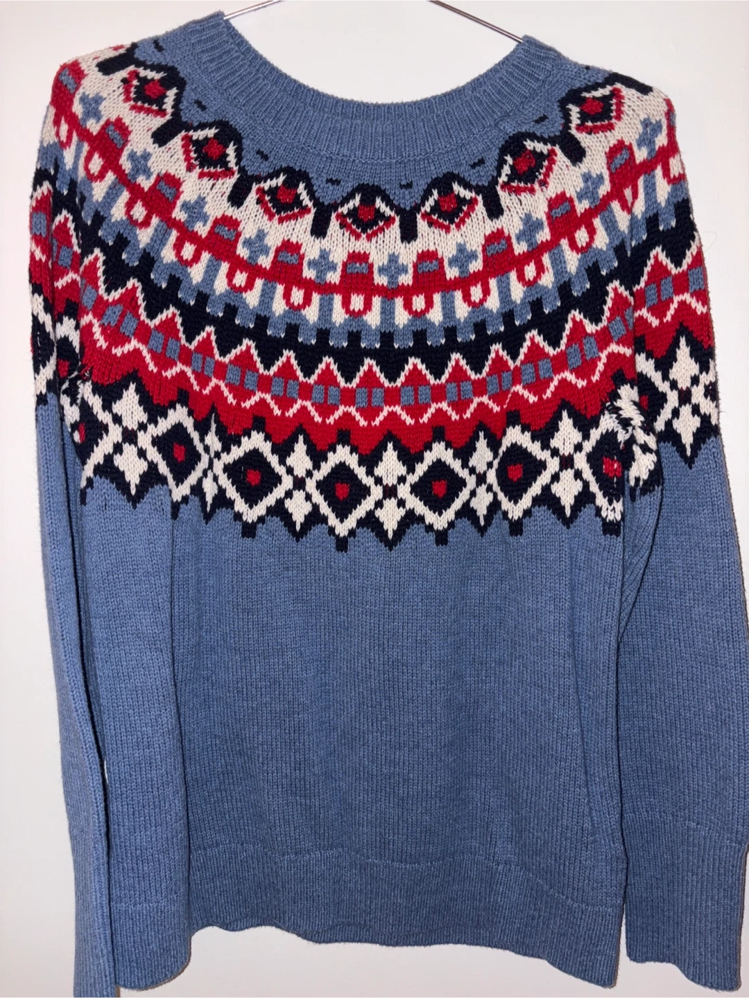 Women’s Chaps sweater with a blue base and a fair isle pattern in red, white, and navy. It's a size medium. The knit material makes it comfy for cooler weather!