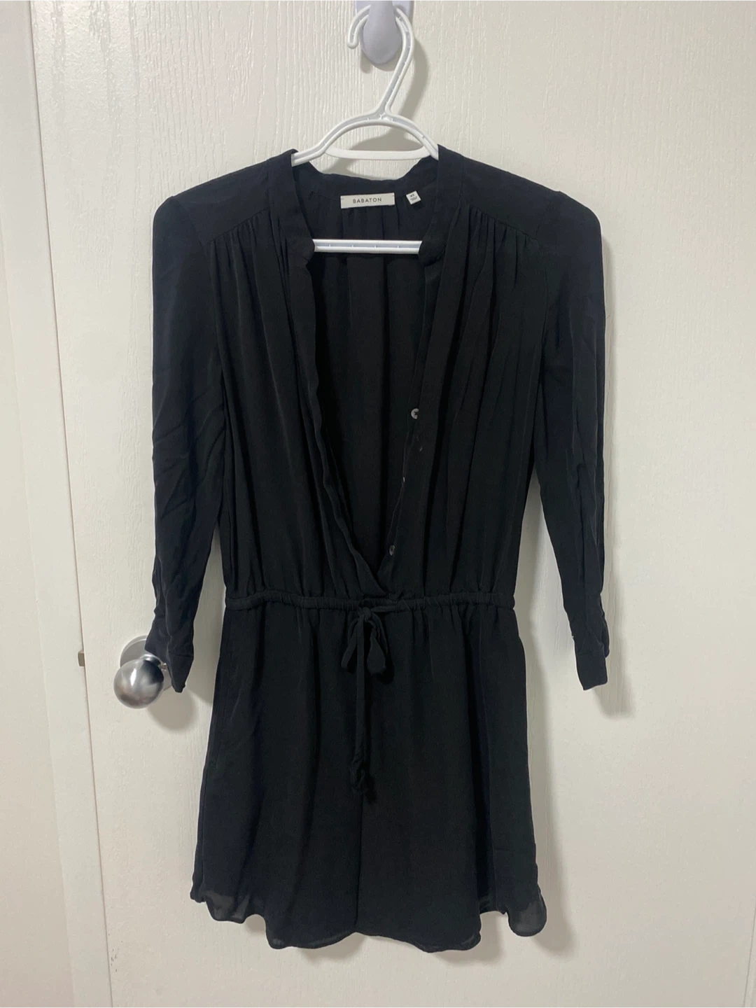This is a black romper from Babaton. It's a size extra small. Cinched waist with a drawstring. Pick up cash only