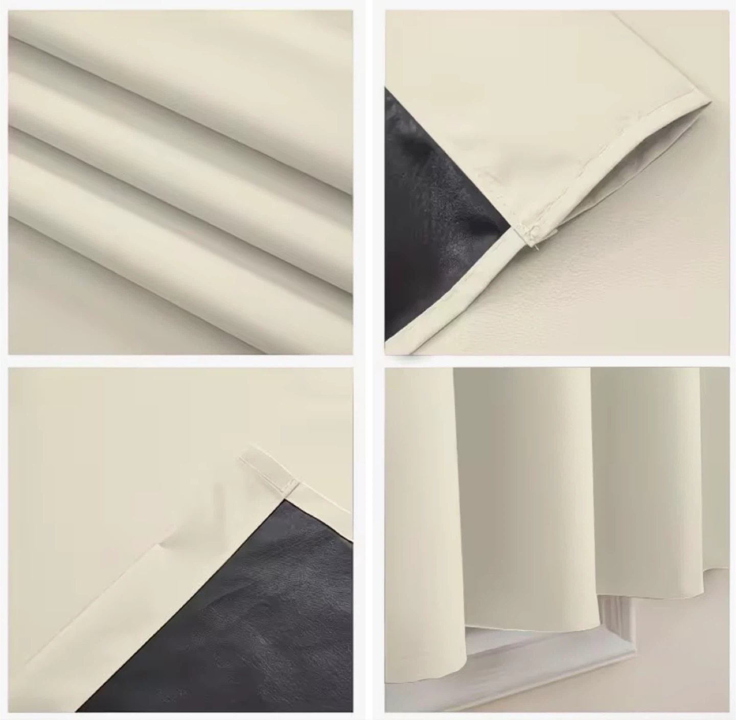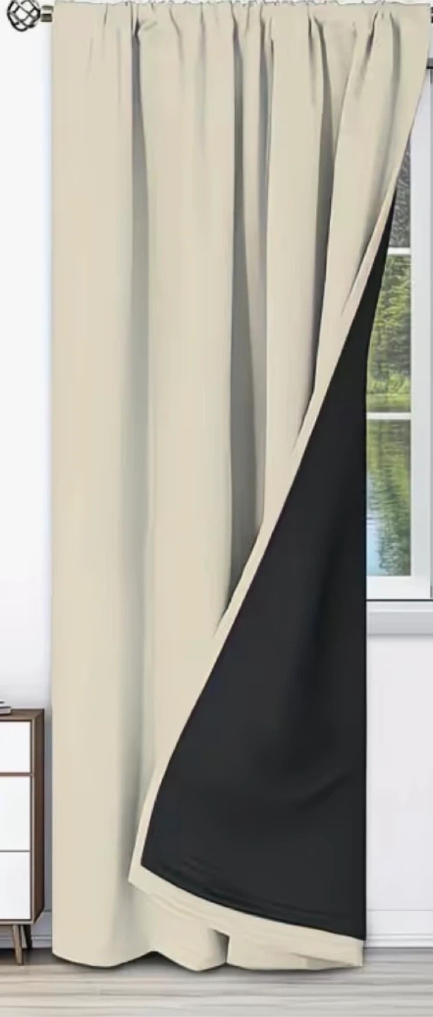 There are 3 blackout curtain panels in a beige color. It features a black lining for light blocking. The fabric has a smooth texture.