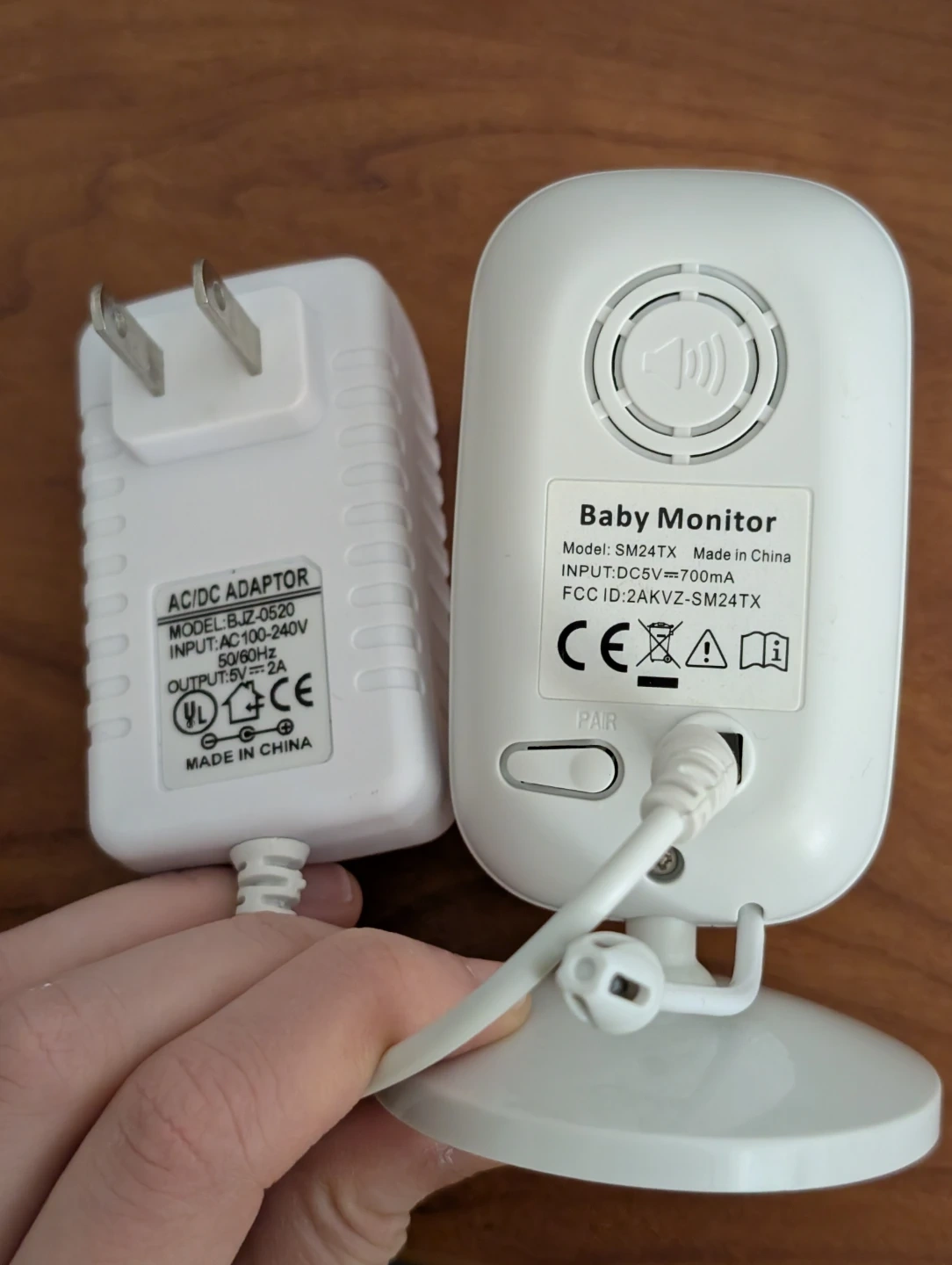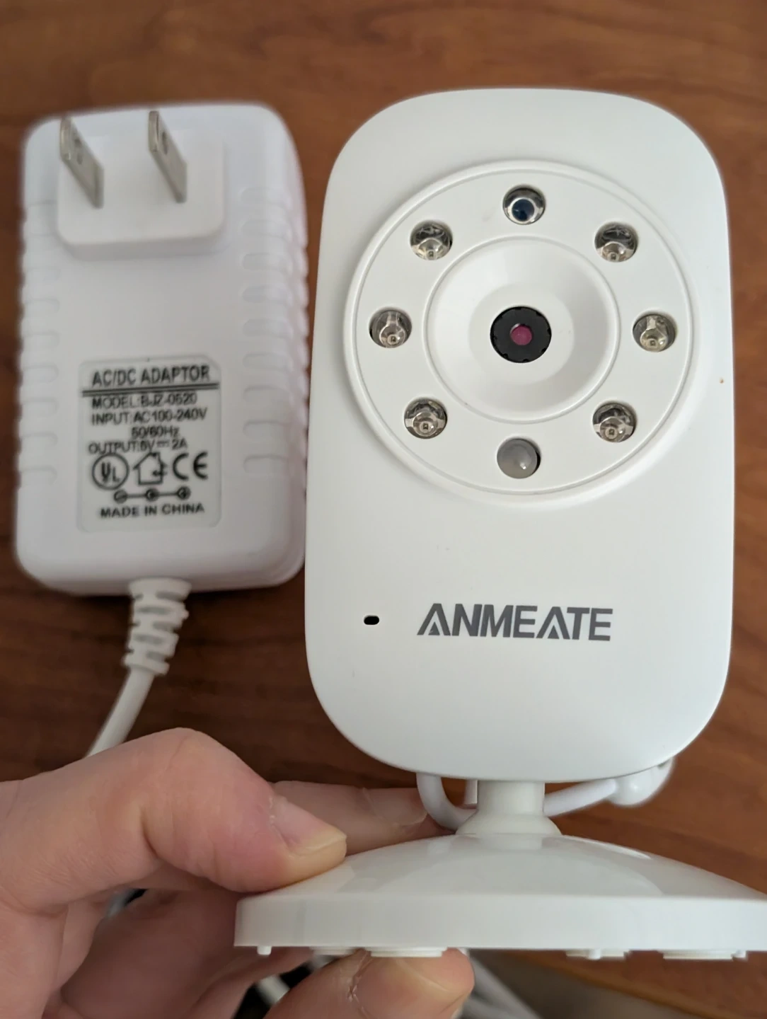 This is an ANMEATE baby monitor, model SM24TX. It comes with a white AC/DC adapter, model BJZ-0520. The monitor uses a 5V power supply.