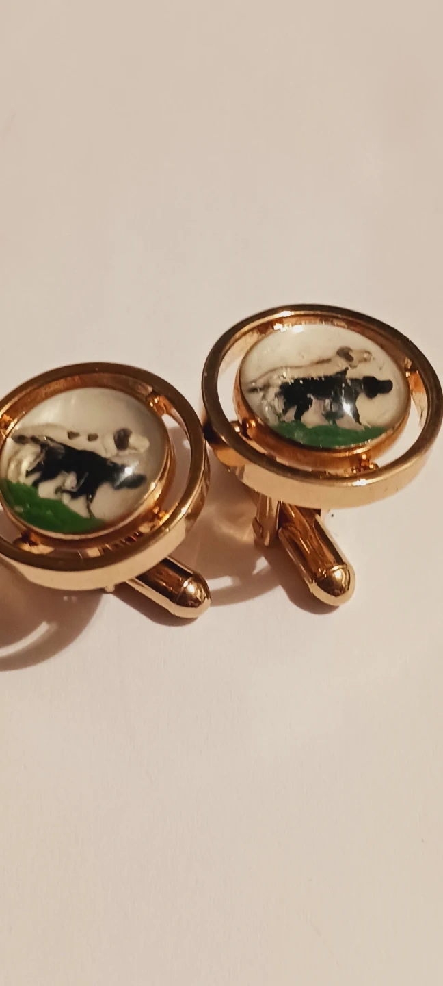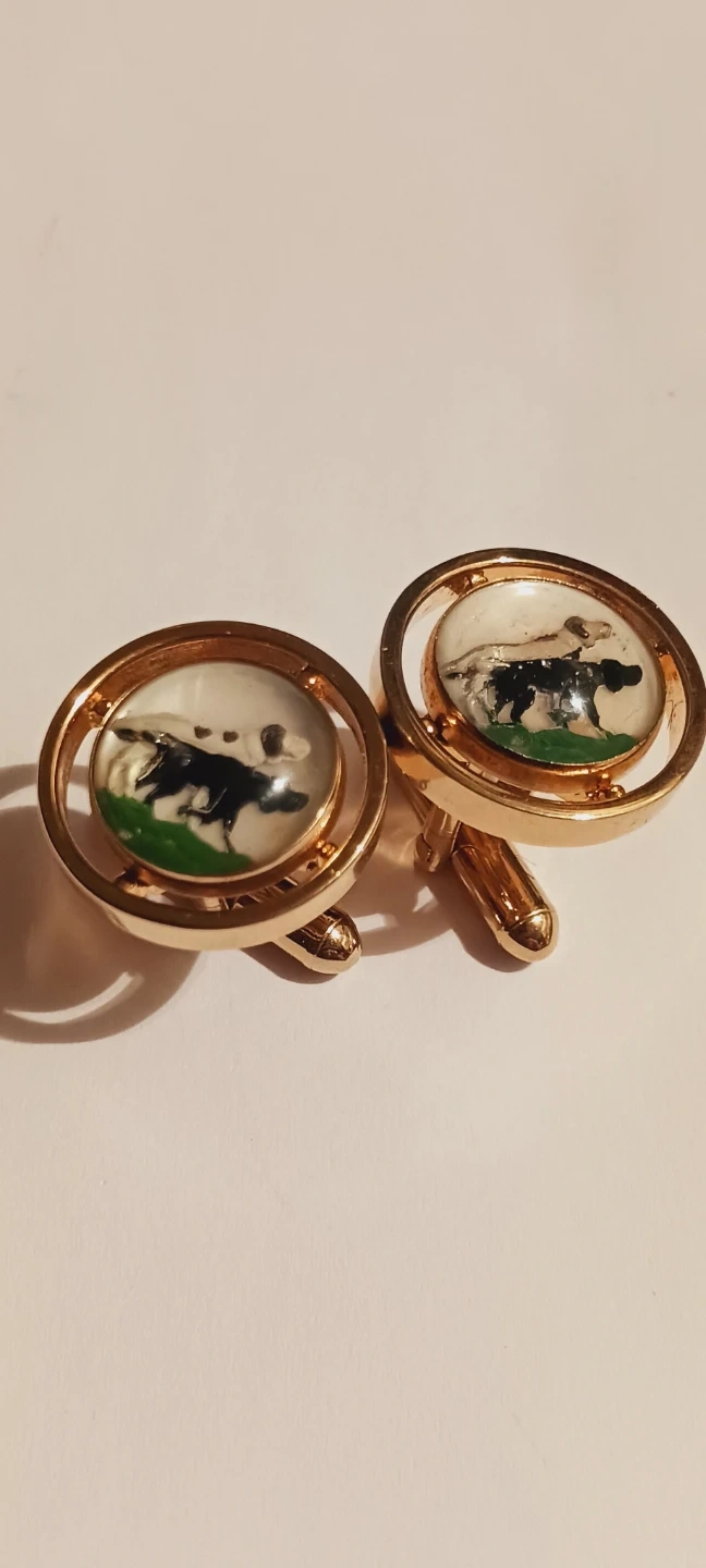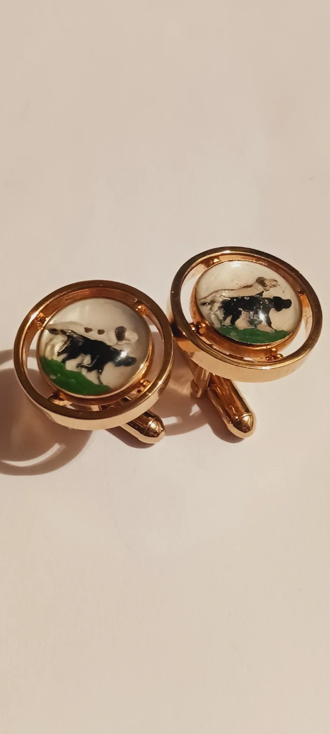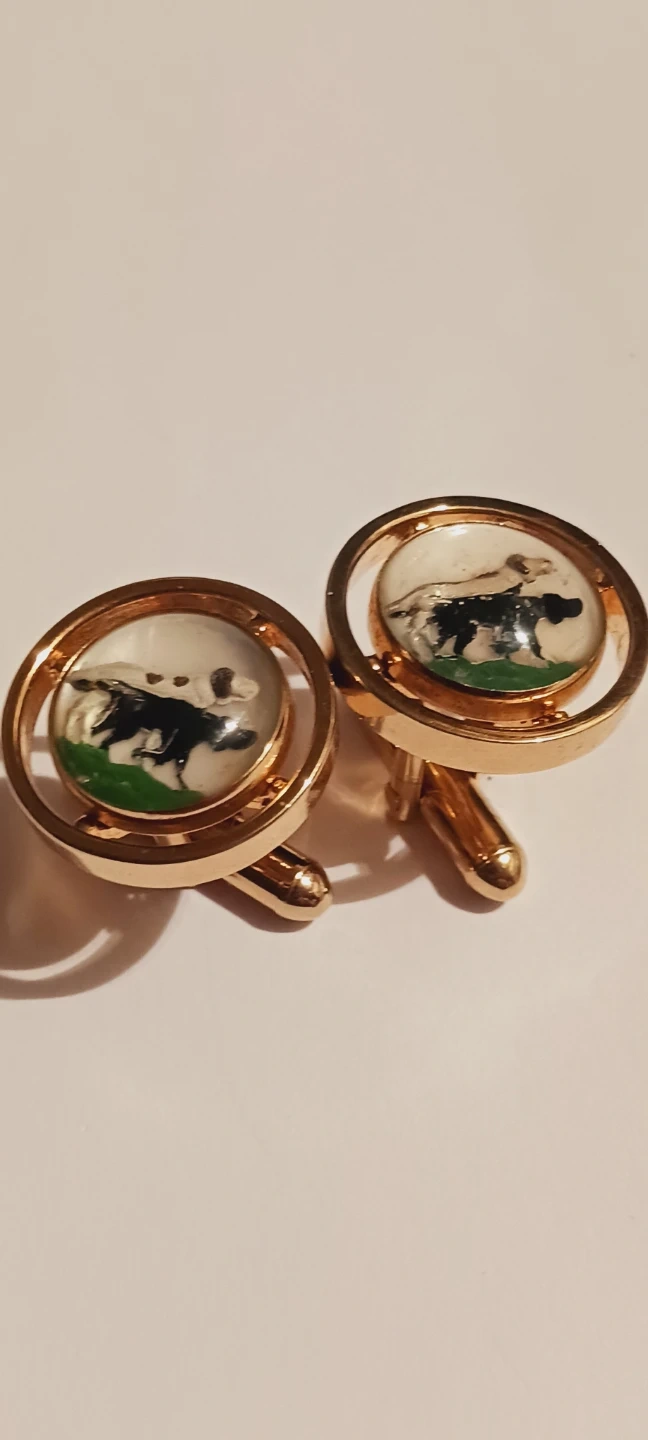 A pair of vintage Scottie Dog Lucite Reverse Carved cufflinks featuring a scene with dogs. These're gold-tone with oval-shaped bases and clear domed tops. The design shows dogs in a field setting. They're a fun accessory for any dog lover!! 1"×1".,Excellent condition. ALL MY PRICES ARE NEGOTIABLE !!