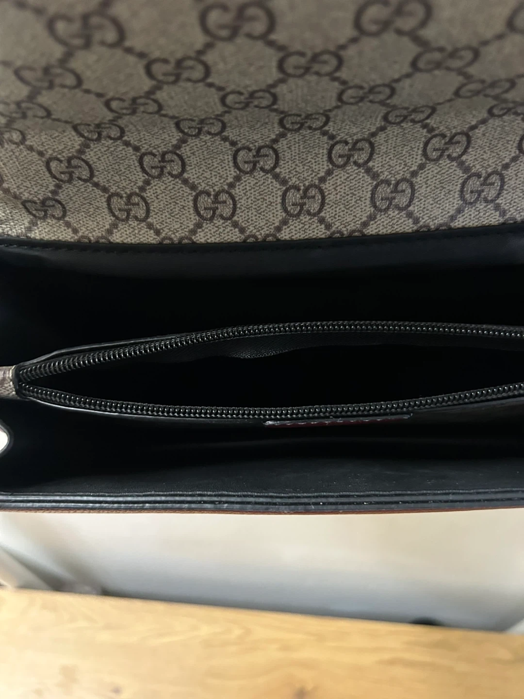 This Gucci shoulder bag features the iconic GG monogram pattern. It has a black chain strap and a red stripe detail. The interior is lined in black with a zippered compartment. Leather trim and a metal horsebit closure accent the front.