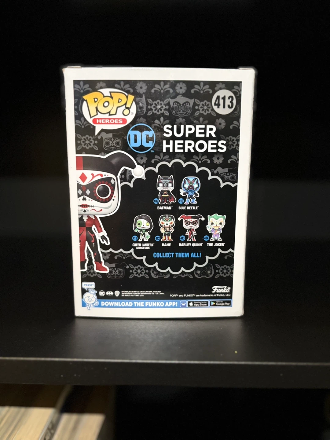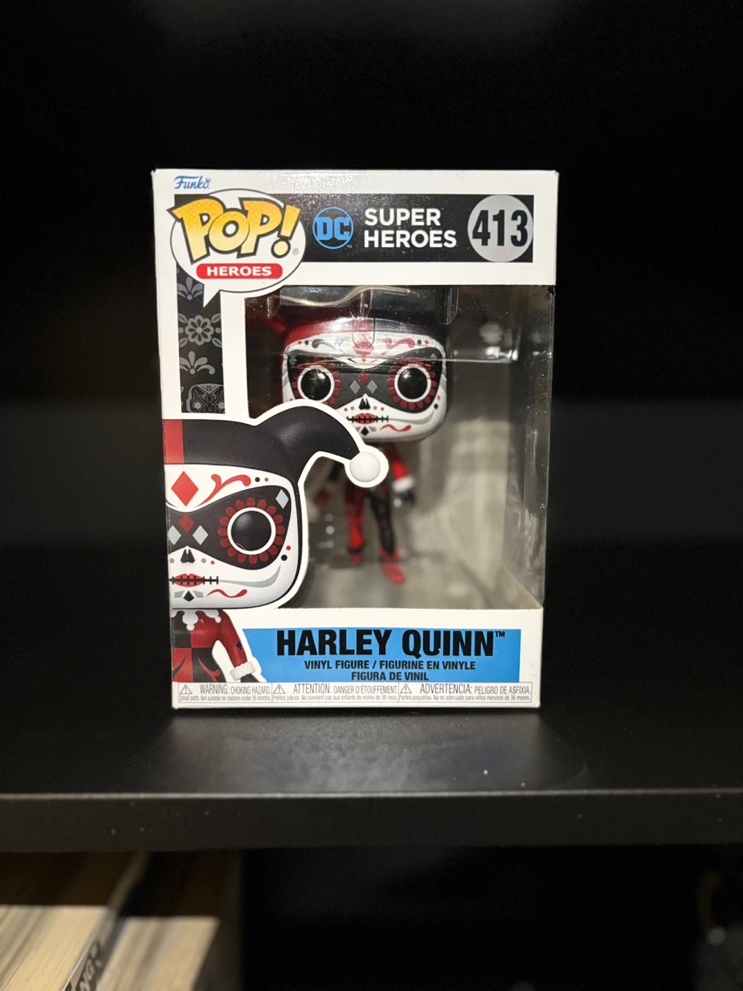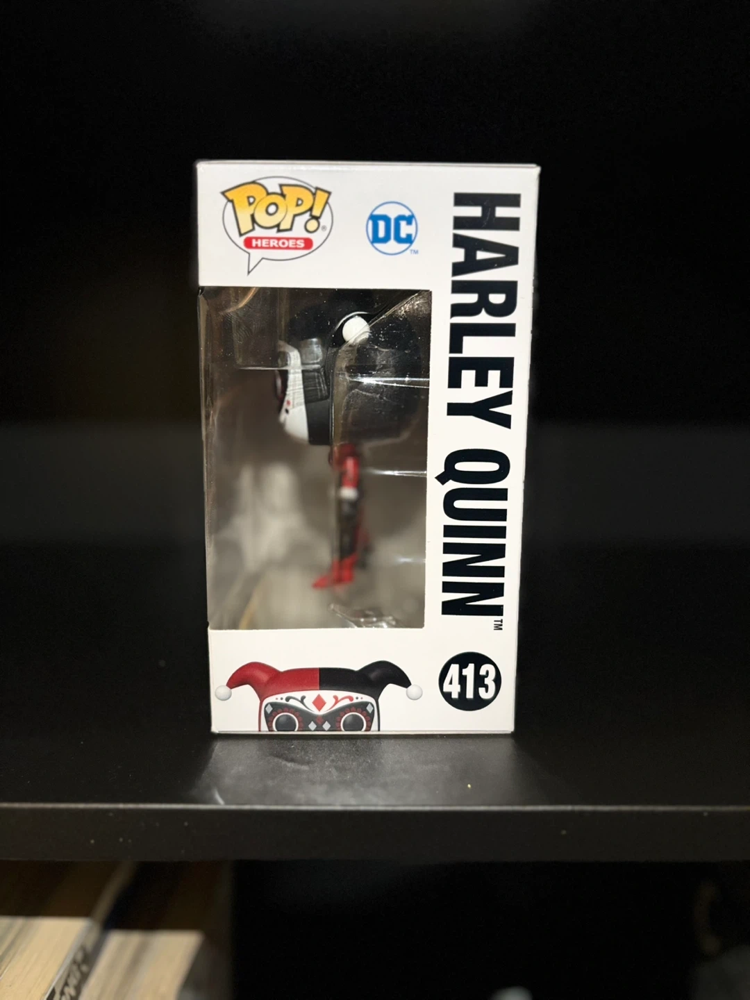 This is a Funko Pop! vinyl figure of Harley Quinn, number 413 in the DC Heroes series. It comes in its original packaging.