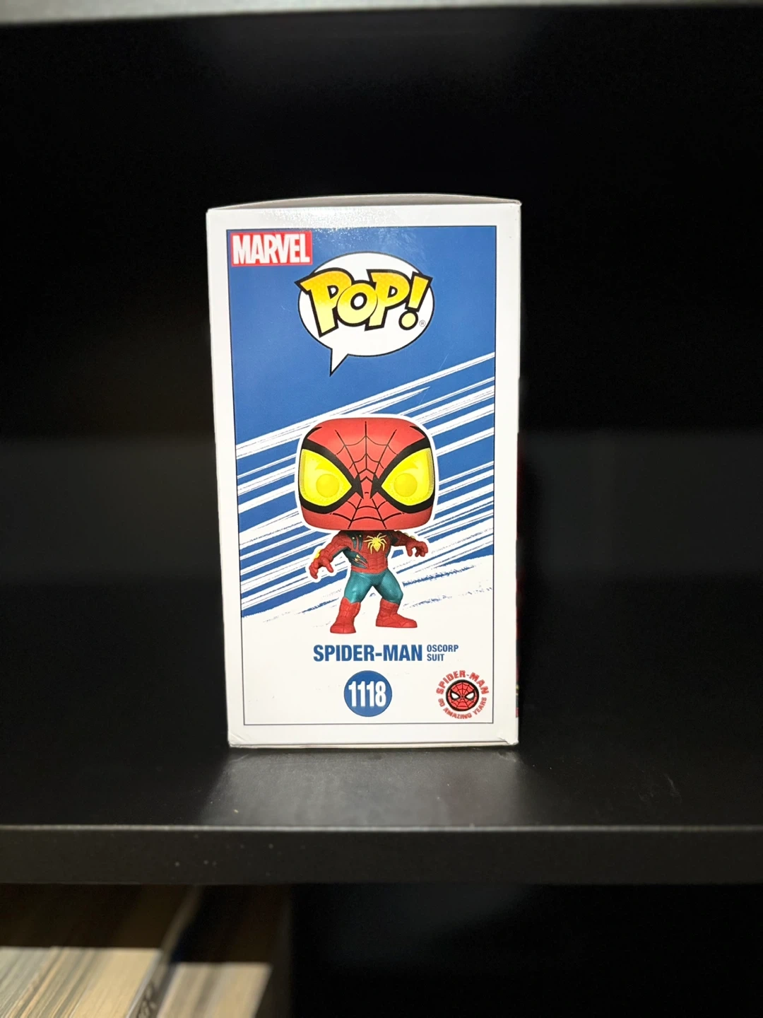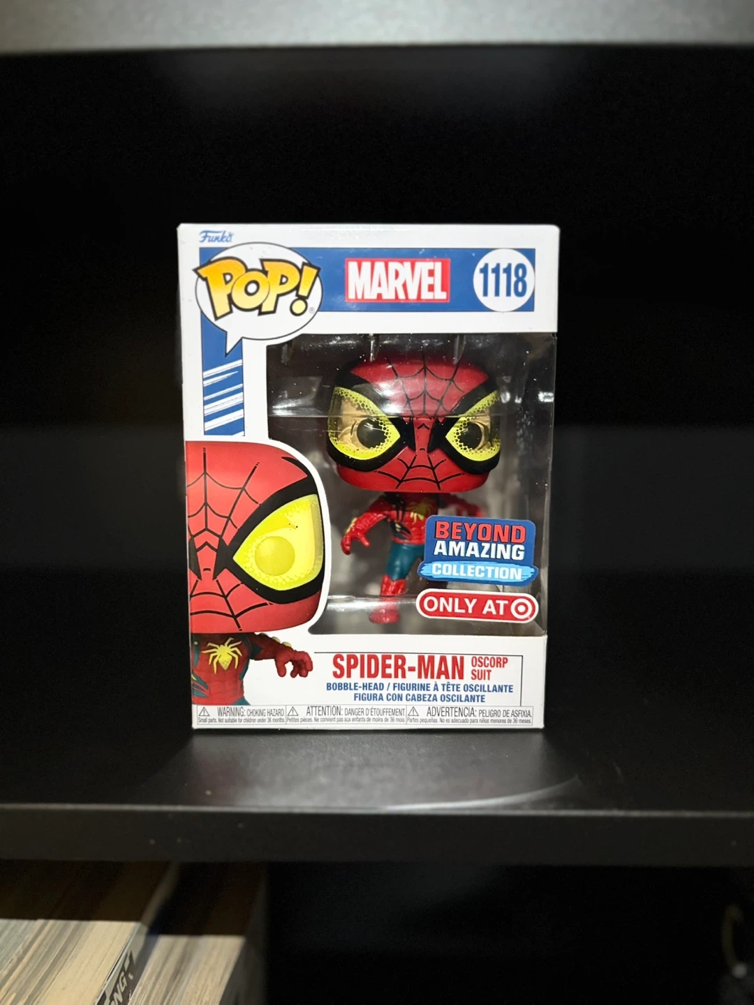 This is a Funko Pop! figure of Spider-Man in his Oscorp Suit. It's part of the Marvel Beyond Amazing collection and is number 1118. The item includes its original box.