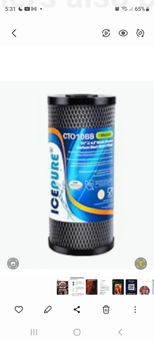 This is an ICEPURE CTO10BB carbon block water filter. It's 10" x 4.5" and rated at 1 micron. This filter is designed for water purification.