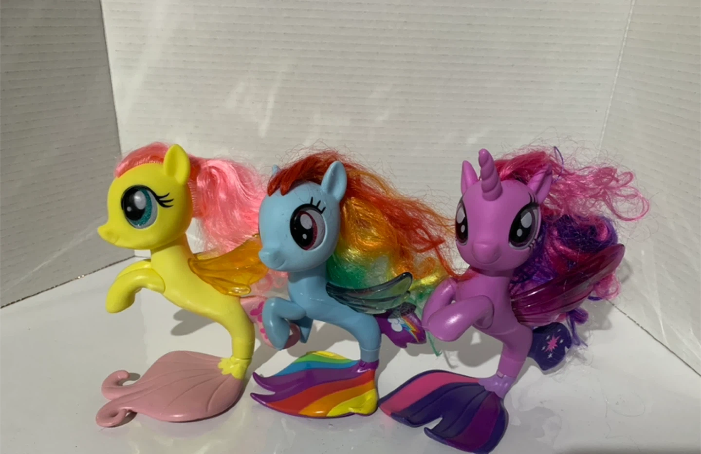 This listing includes three My Little Pony sea pony figures. Fluttershy is yellow with pink hair and a pink tail. Rainbow Dash is blue with rainbow hair and a rainbow tail. Twilight Sparkle is purple with pink and purple hair. These figures are great for fans of the My Little Pony franchise!
