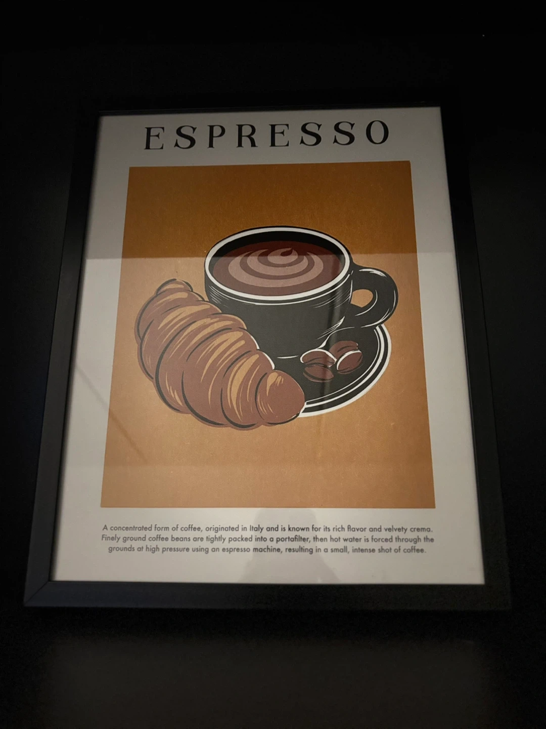 This framed art print features a stylized illustration of an espresso cup with a croissant and coffee beans. The text describes the concentrated form of coffee originated in Italy. It's a nice decorative piece for any coffee lover!
