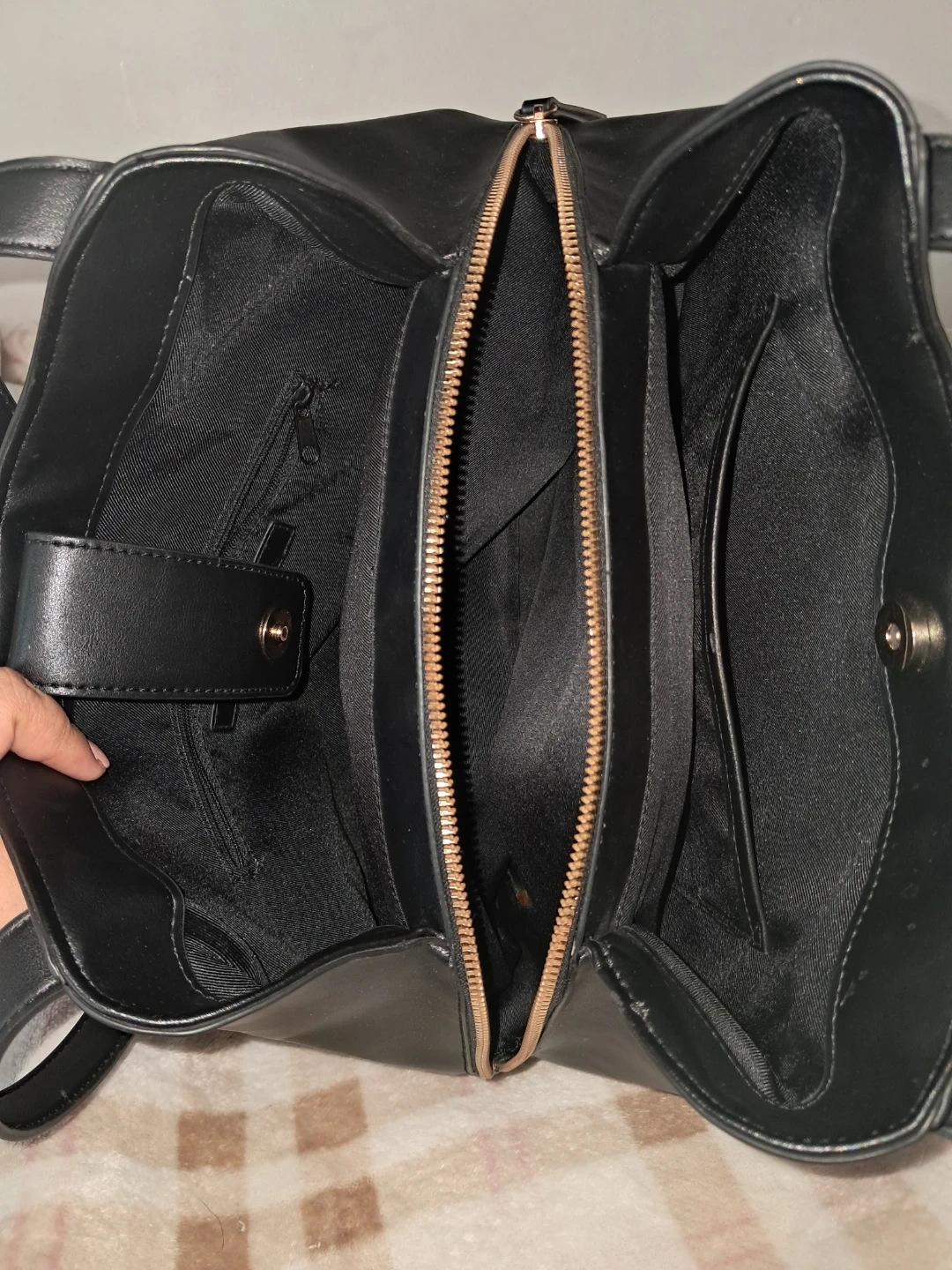 This is a stylish black shoulder bag from Nine West. It's made with a textured outer material and features a spacious interior with multiple compartments. The bag closes with a zipper and has comfortable shoulder straps.