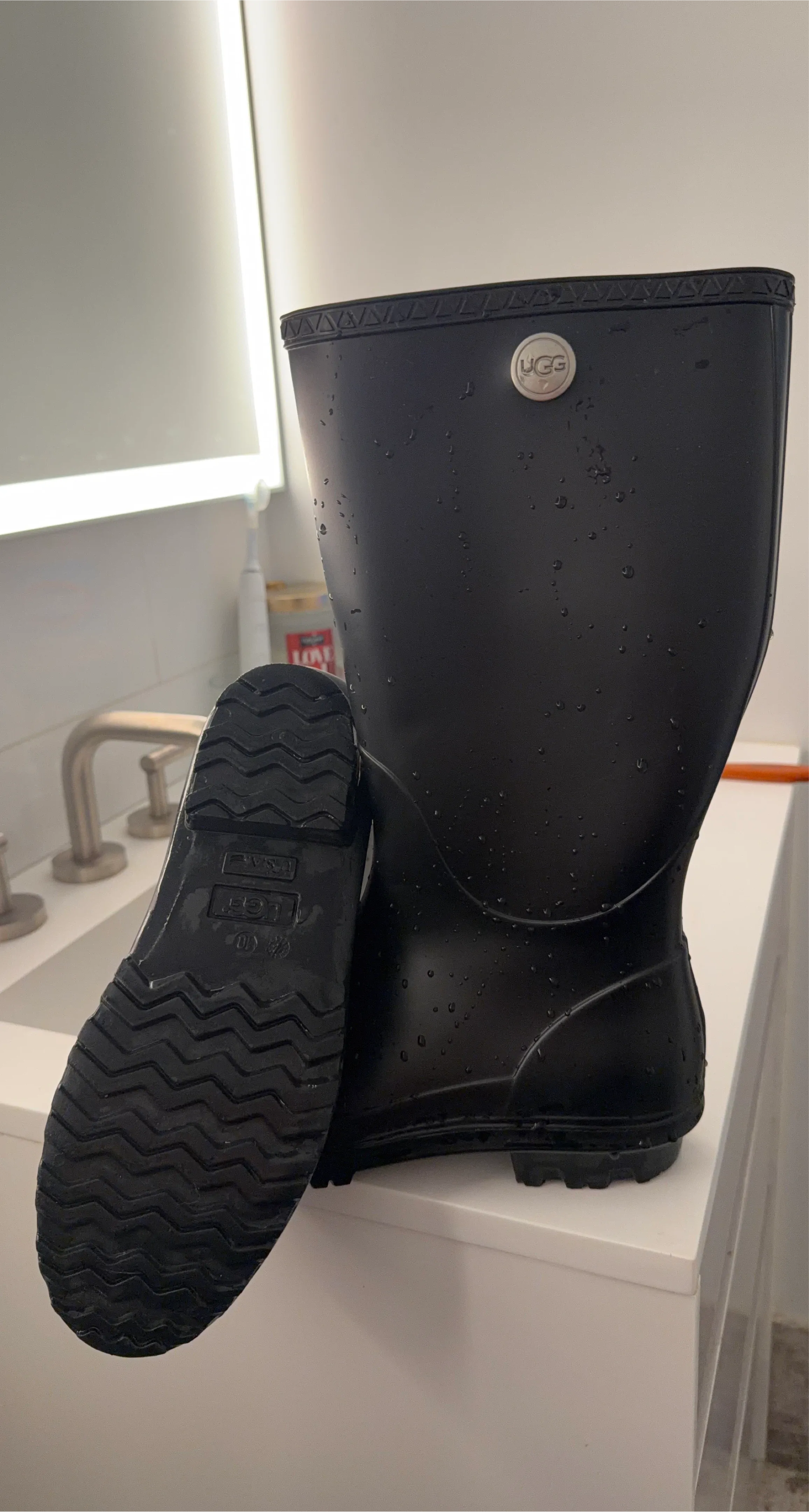 These are UGG brand black rubber rain boots. They are waterproof and have a grippy sole for traction. Perfect for rainy days!