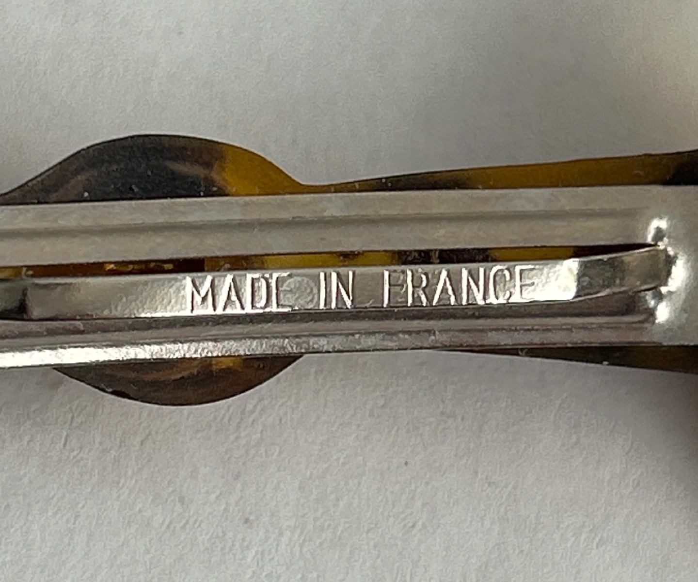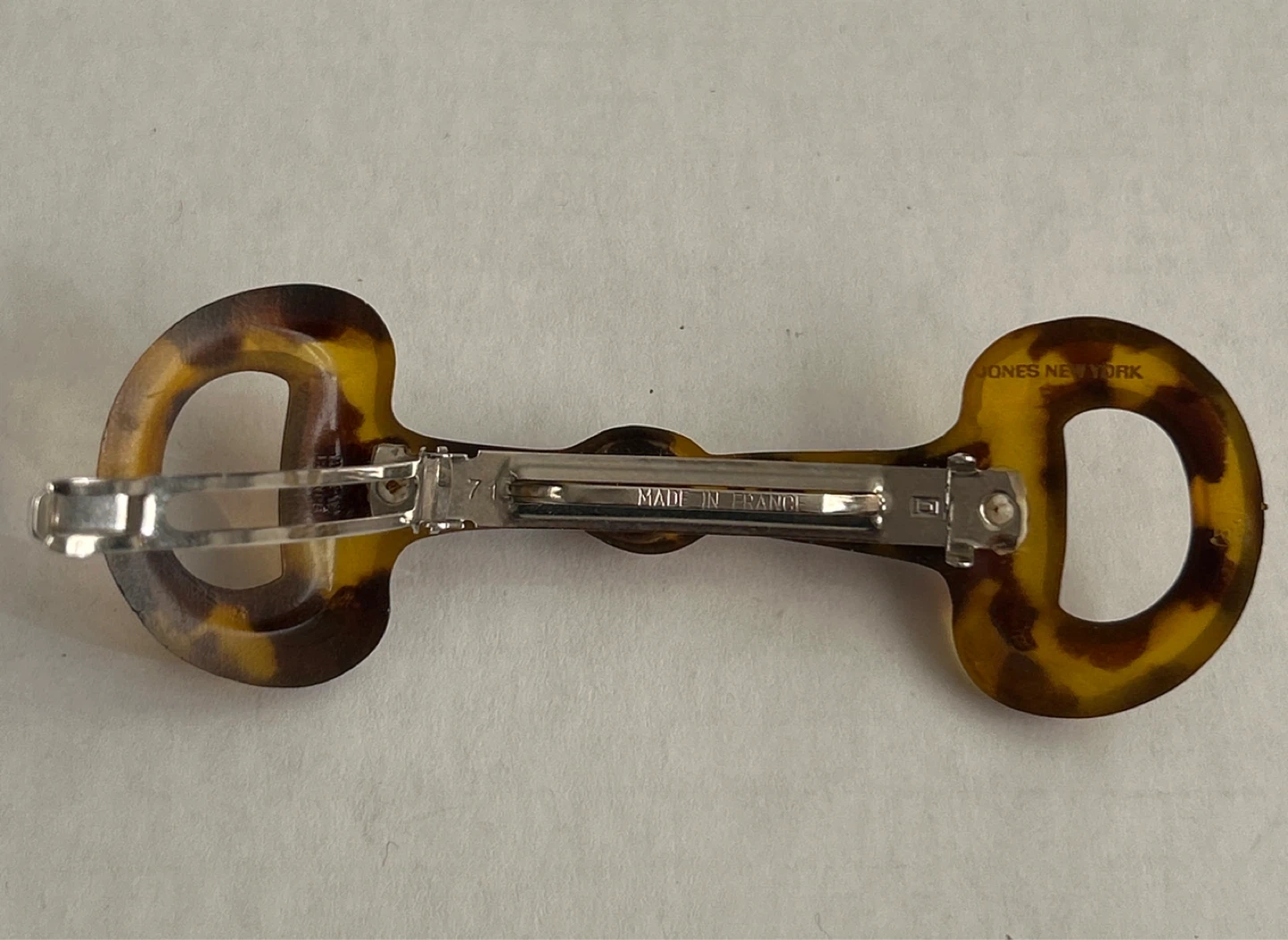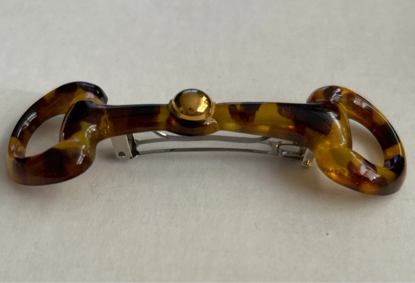 This barrette by Jones New York features a classic tortoise-shell pattern in a horse bit snapple design with a gold-toned accent. It's made in France, ensuring quality craftsmanship. The clip is sturdy and holds hair securely. Great condition.
