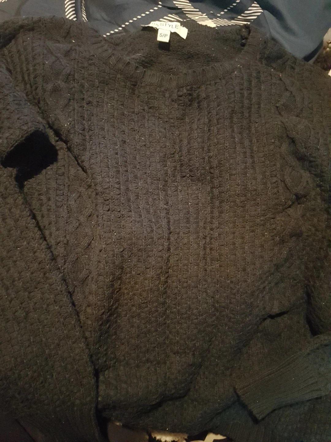 Navy Blue crewneck sweater with a textured knit pattern. It's a size S/P. Perfect for layering on cooler days!
