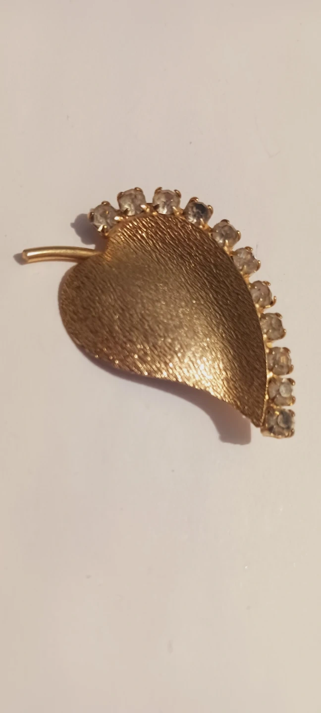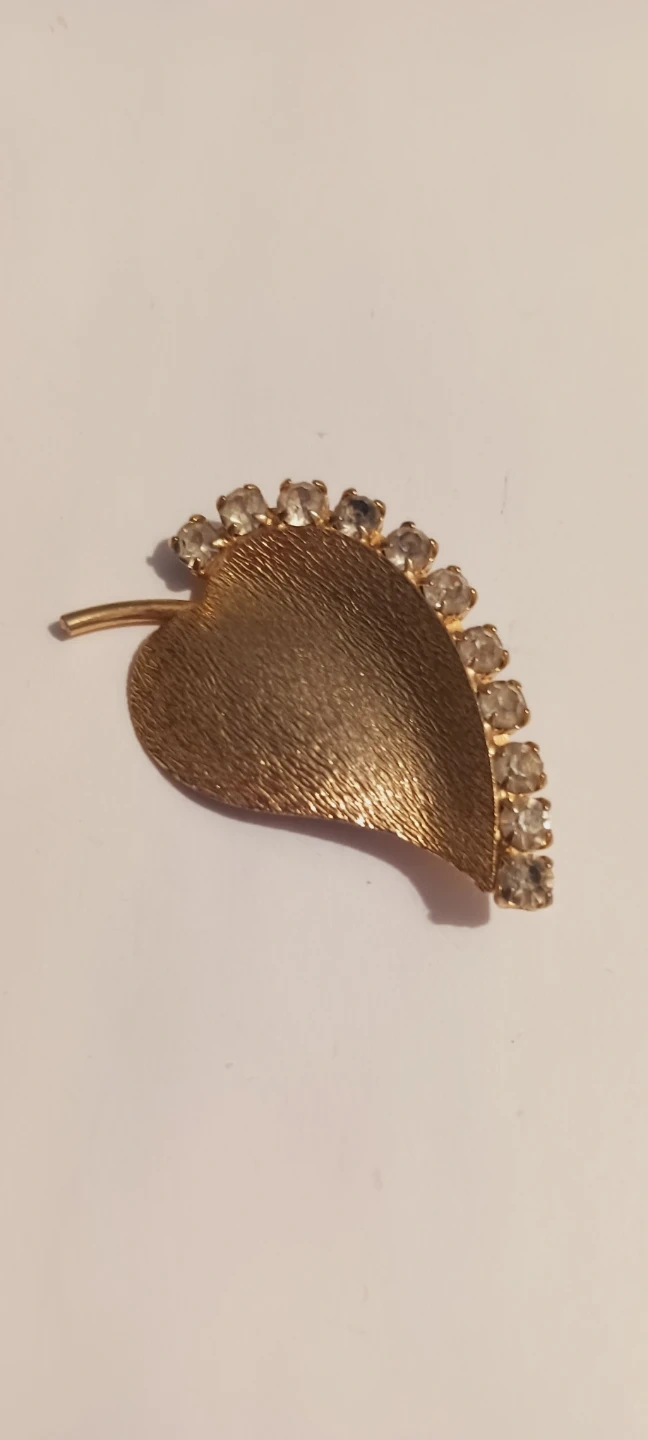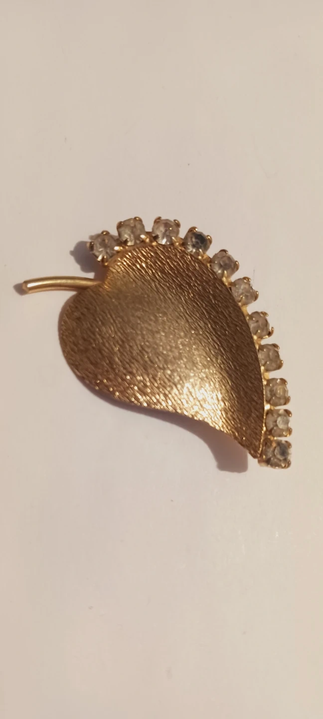 Cute Vintage Leaf-shaped brooch in a gold tone finish. It's adorned with clear rhinestones along the edge. Features a textured surface detail. 1.5"×1". ALL MY PRICES ARE NEGOTIABLE !!