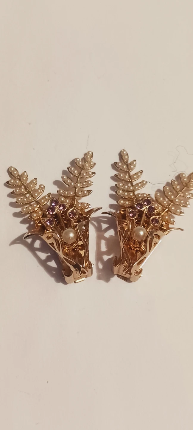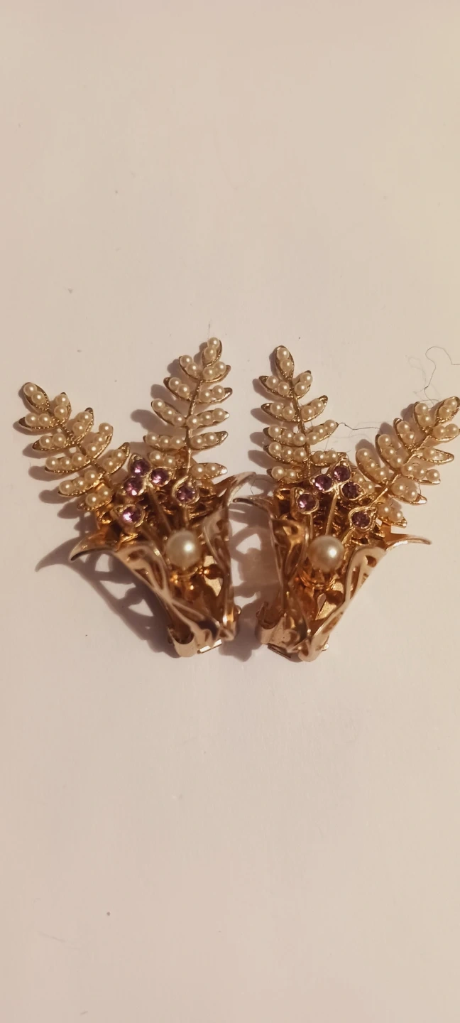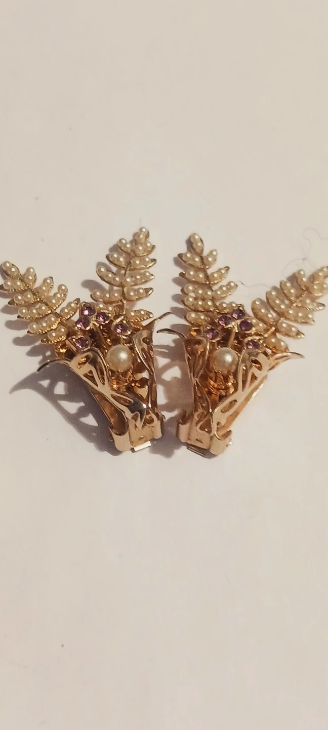These Charming Vintage clip-on earrings feature a gold-tone design with delicate pearl accents and small purple stones. They're shaped like leafy branches. The clip-on backs ensure an easy fit. They'd be a lovely addition to a vintage jewelry collection!! 1.5"×1.5". Excellent condition. ALL MY PRICES ARE NEGOTIABLE !!