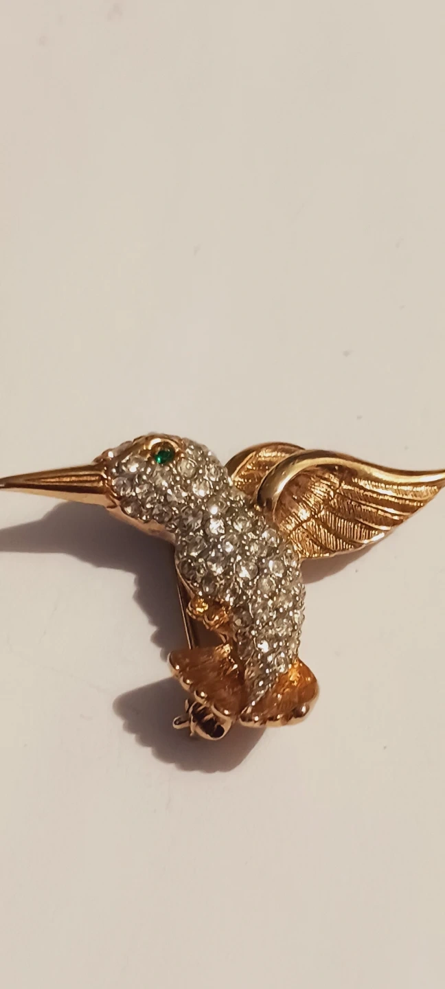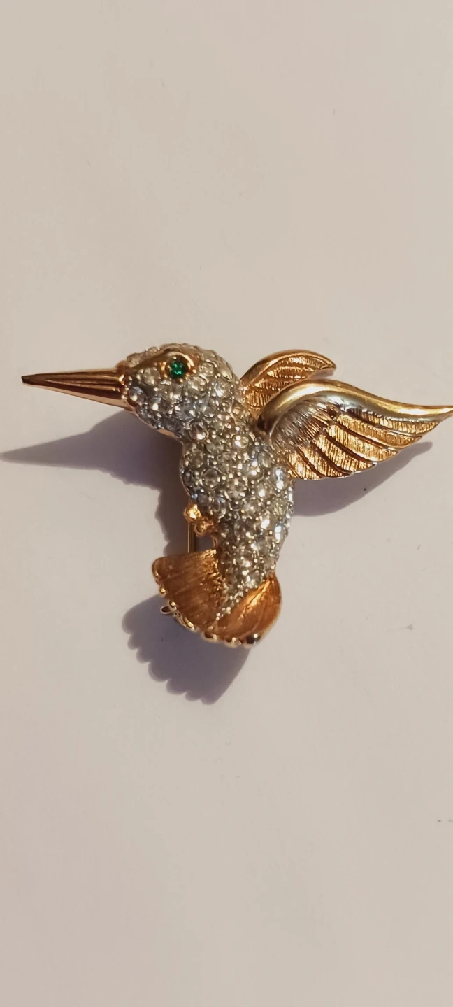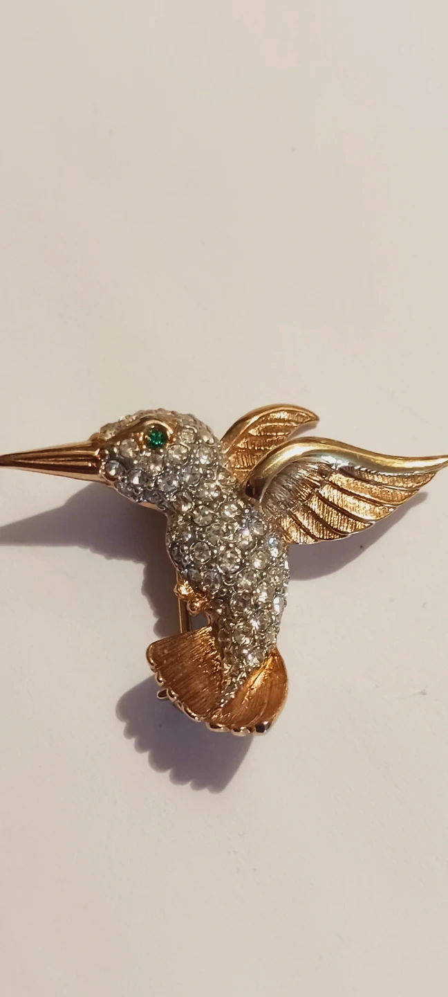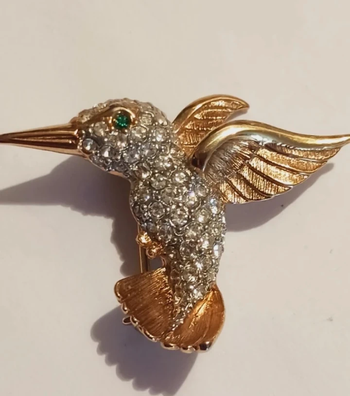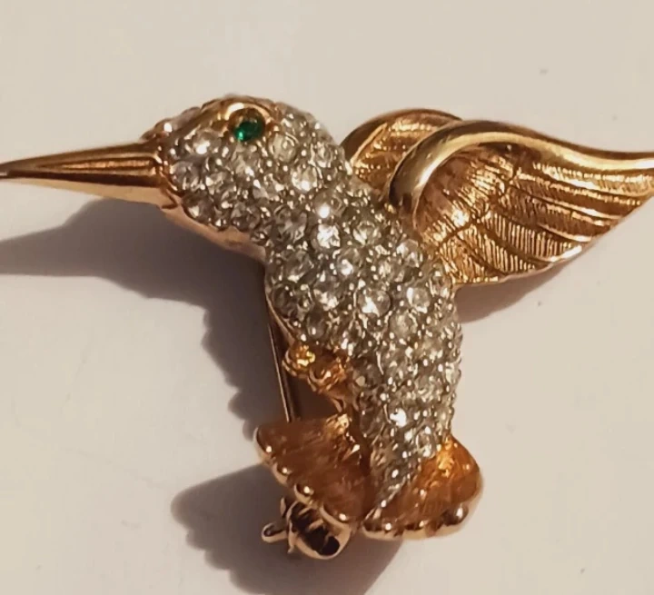 This charming hummingbird brooch is adorned with sparkling rhinestones and features a green gemstone eye. It's made with a gold-tone metal finish. The pin closure is secure. 1.5"×1.5". Excellent condition. ALL MY PRICES ARE NEGOTIABLE !!