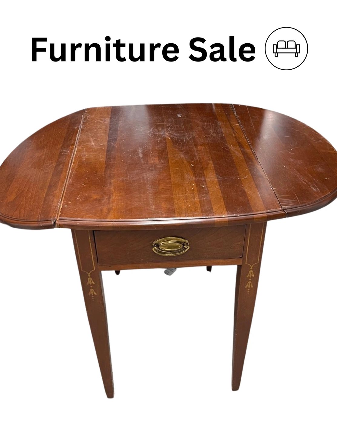 Beautiful solid wood drop-leaf table with elegant tapered legs and subtle inlay detail. Features two folding leaves that allow it to shift easily from compact to expanded, making it ideal for flexible use.Works well as a small dining table, game table, accent table, or occasional workspace. A timeless design that fits comfortably in traditional, vintage-inspired, or collected interiors.