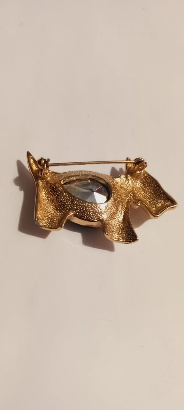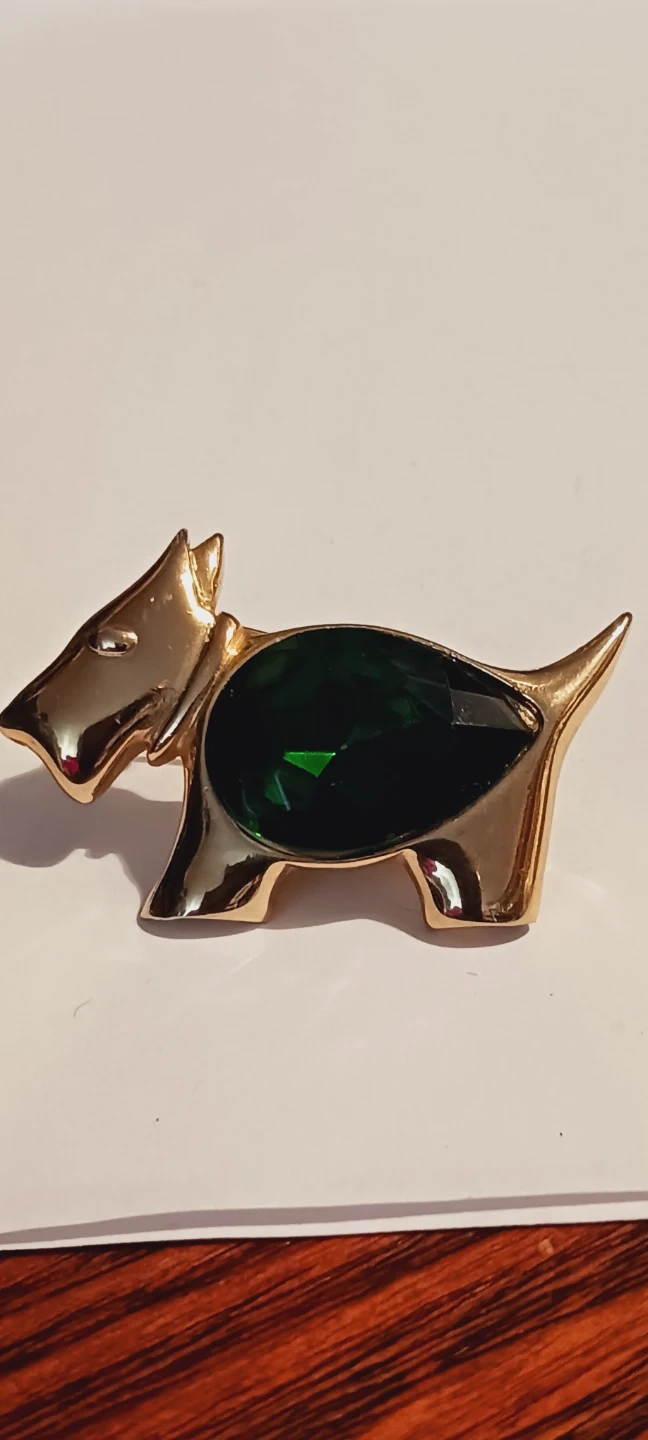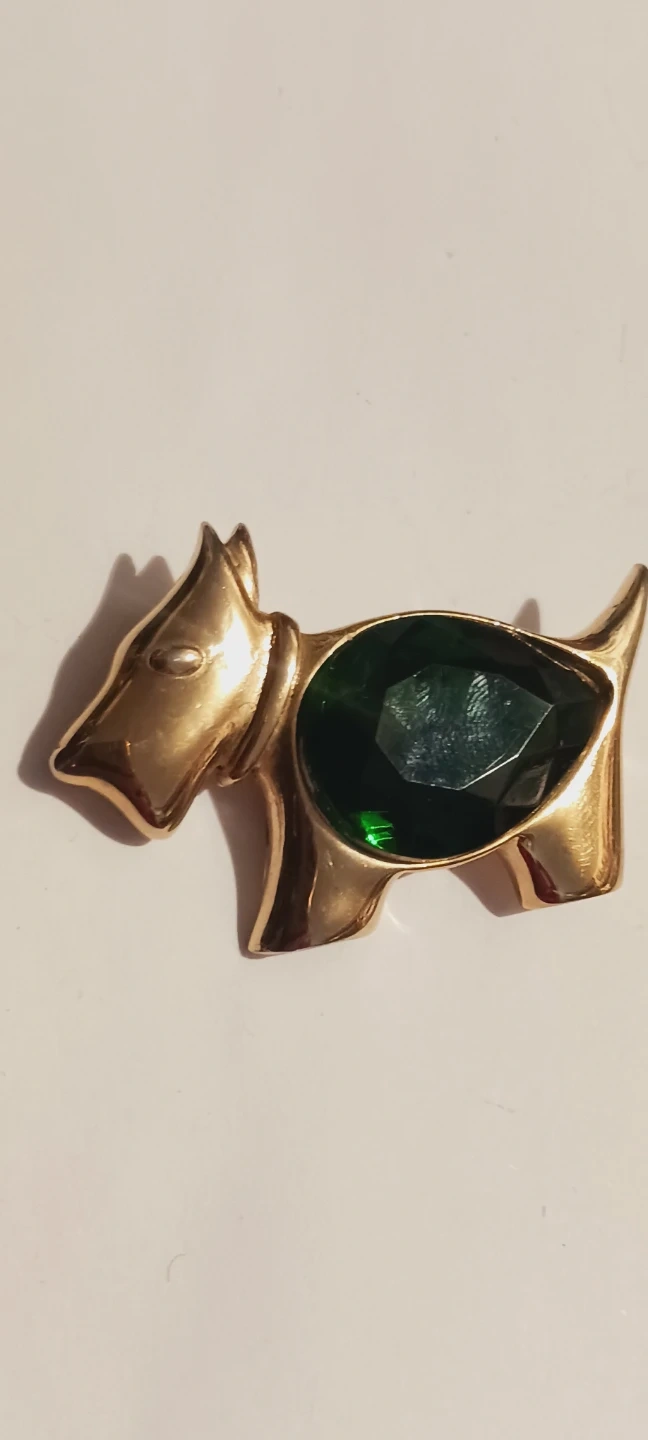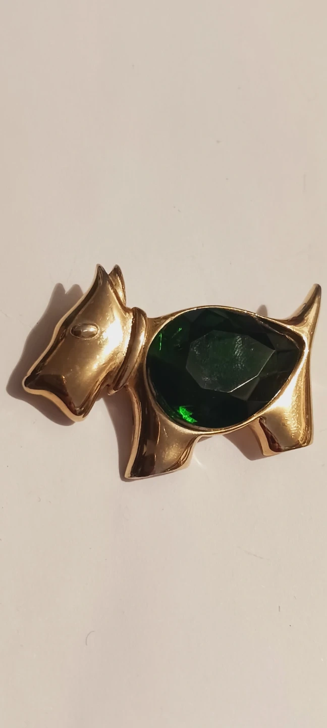 This charming brooch features a scottie dog design with a gold-tone finish. It's accented with a large, faceted green gemstone. The clasp on the back is secure. 2"×1.3". Excellent condition, like new. ALL MY PRICES ARE NEGOTIABLE !!