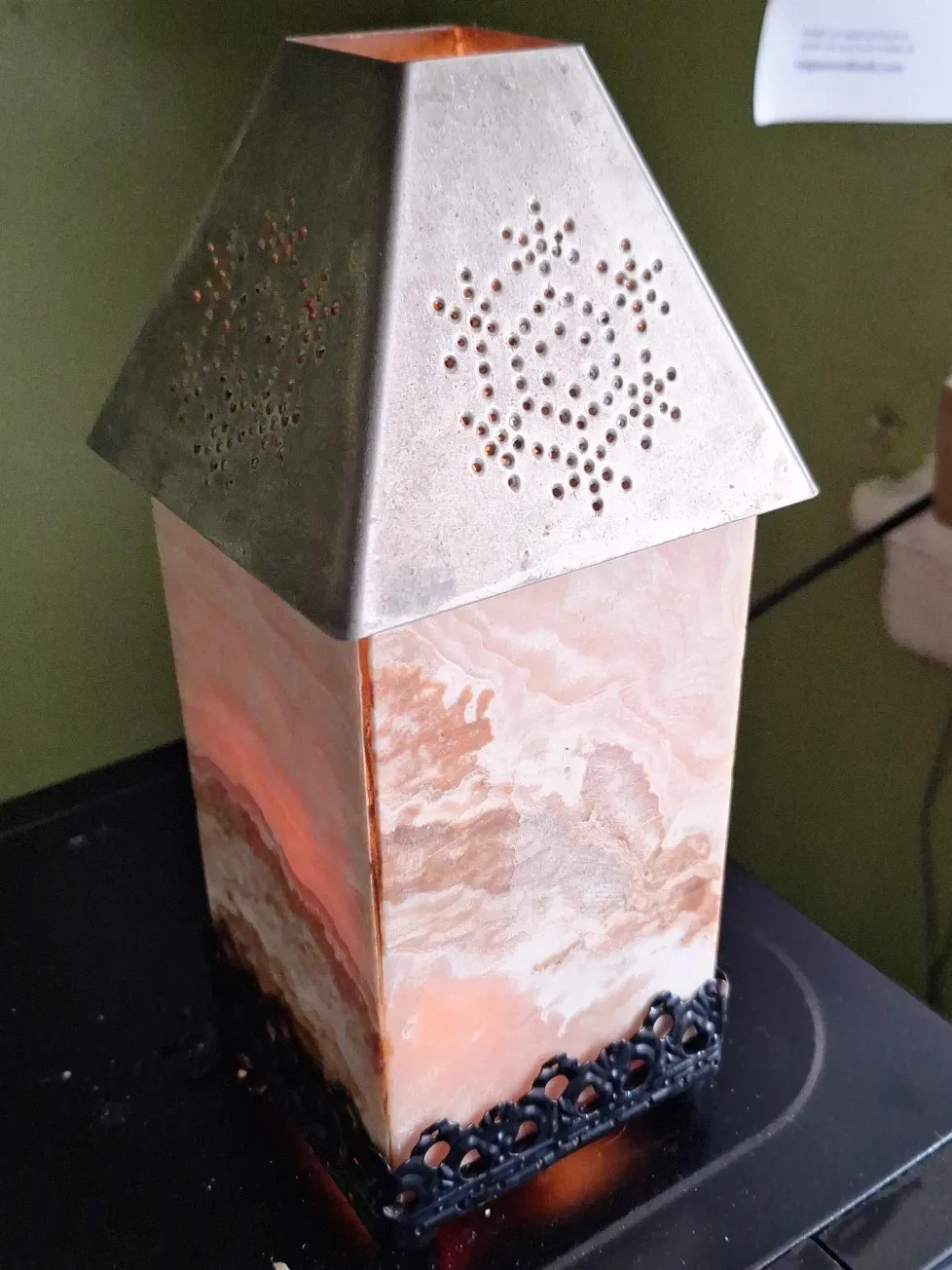 This is a decorative wax melt warmer lamp. It has a marble-like base with swirling pink and white patterns. The top is a metal shade with a perforated design that casts a warm glow. It's a lovely piece to add ambiance to a room!